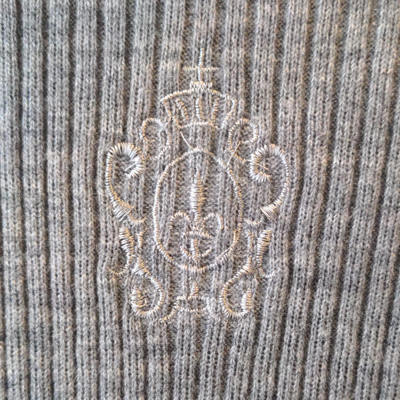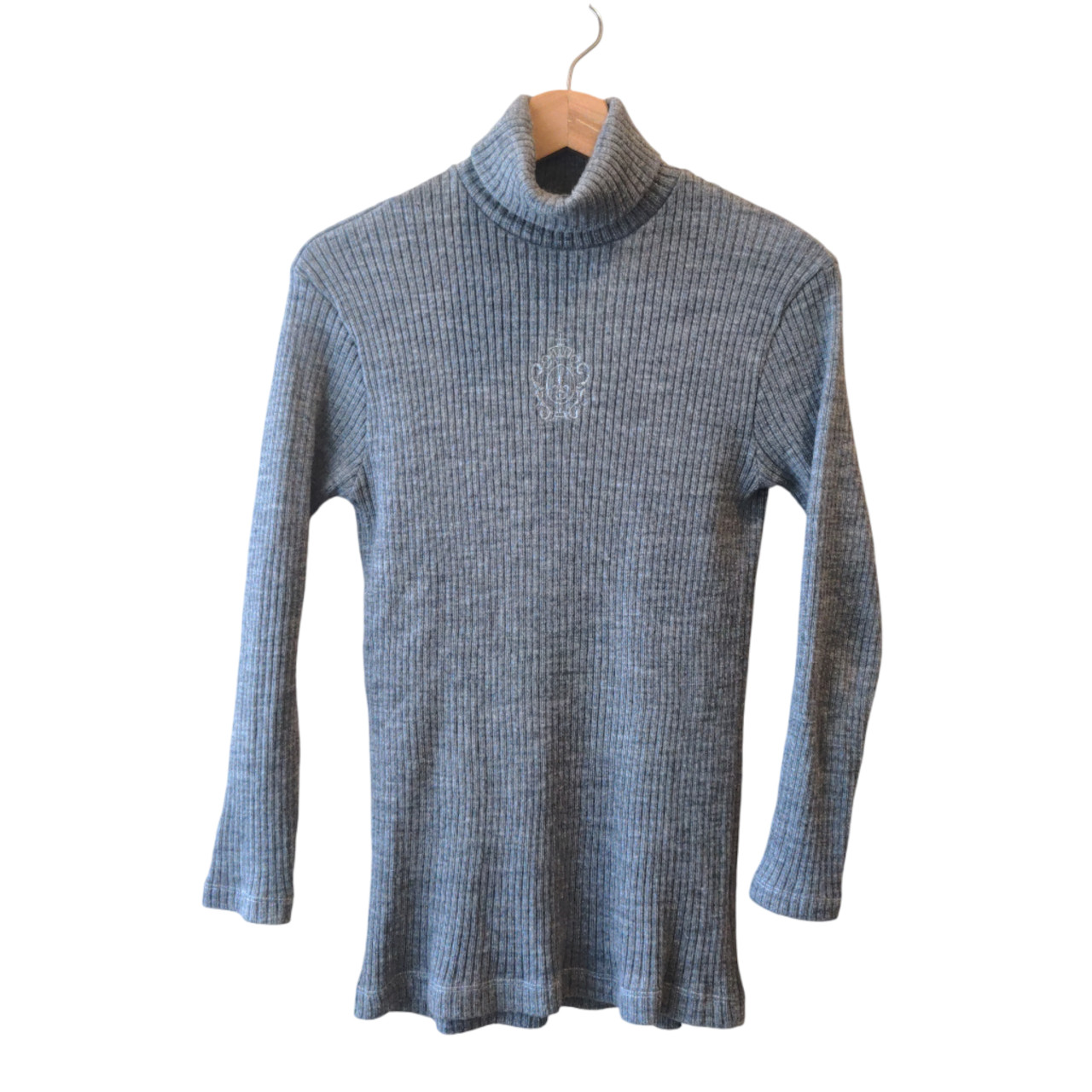 Polera gris melange estilo morley de lana sintética. Tiene un bordado en el pecho de un escudo al mismo tono.