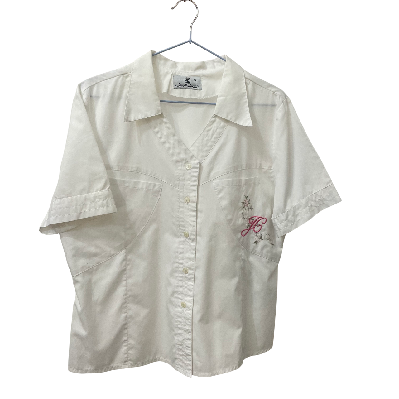 Camisa blanca de algodòn manga corta, tiene bolsillos al frente que siguen el diseño del corte de la camisa y uno de ellos tiene bordado de las iniciales de la marca JC y flores.