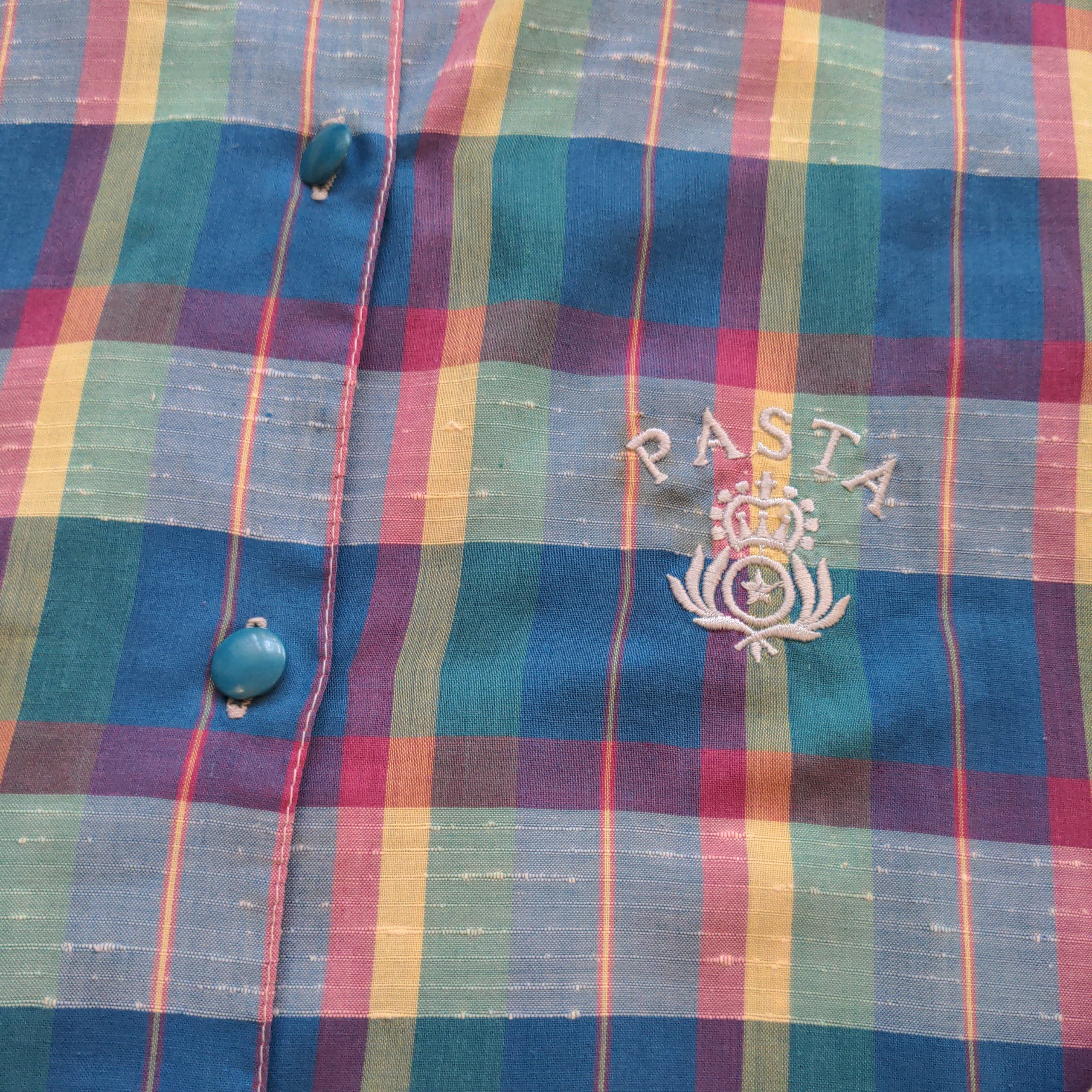 Camisa de algodón trama escocesa en tonos celeste, amarillo, rosa y verde pastel. Abotonada al frente y con un poqueño bordado en al pecho.