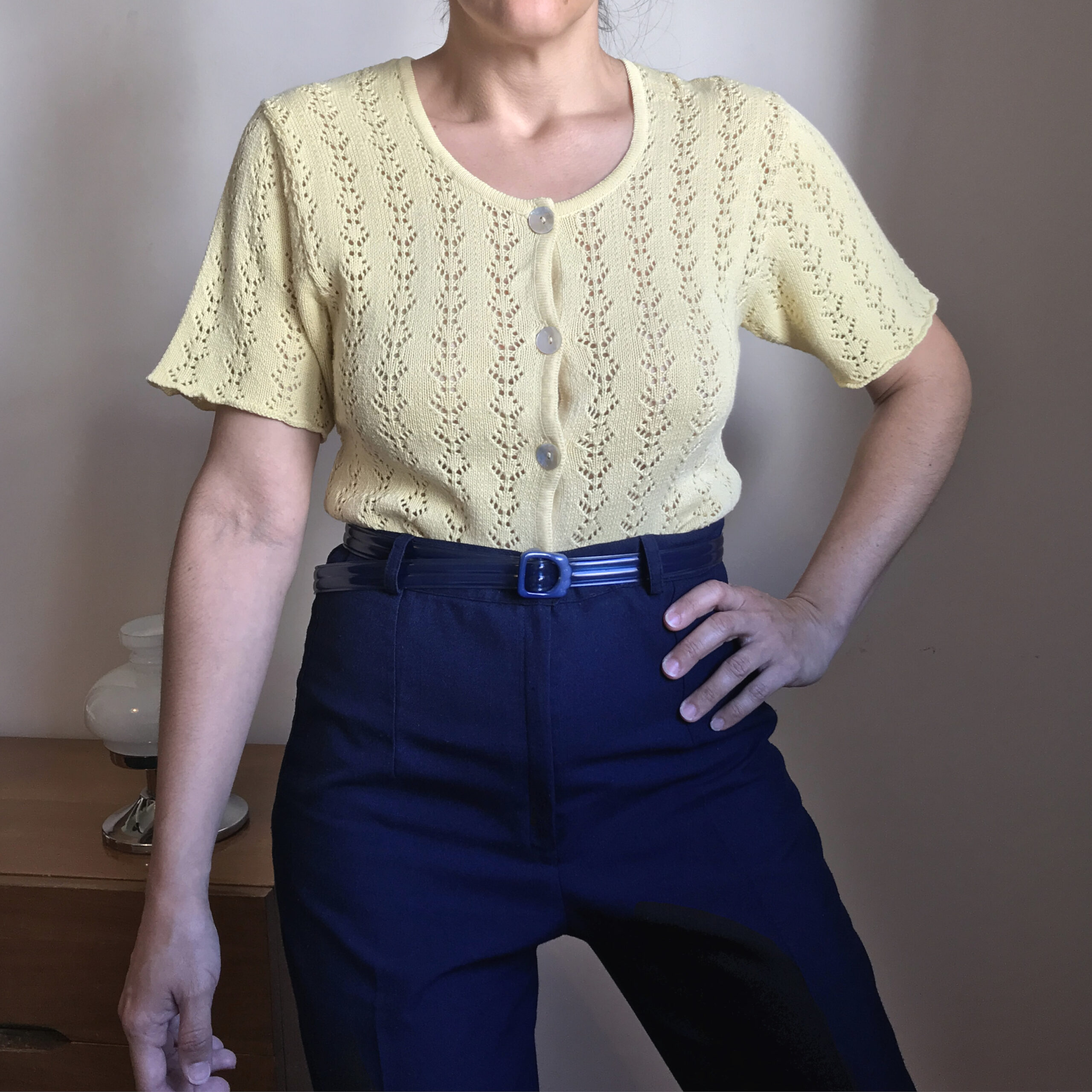 Remera de hilo de algodón calada, manga corta y cuello redondo. Cierra al frente con botones de nácar.