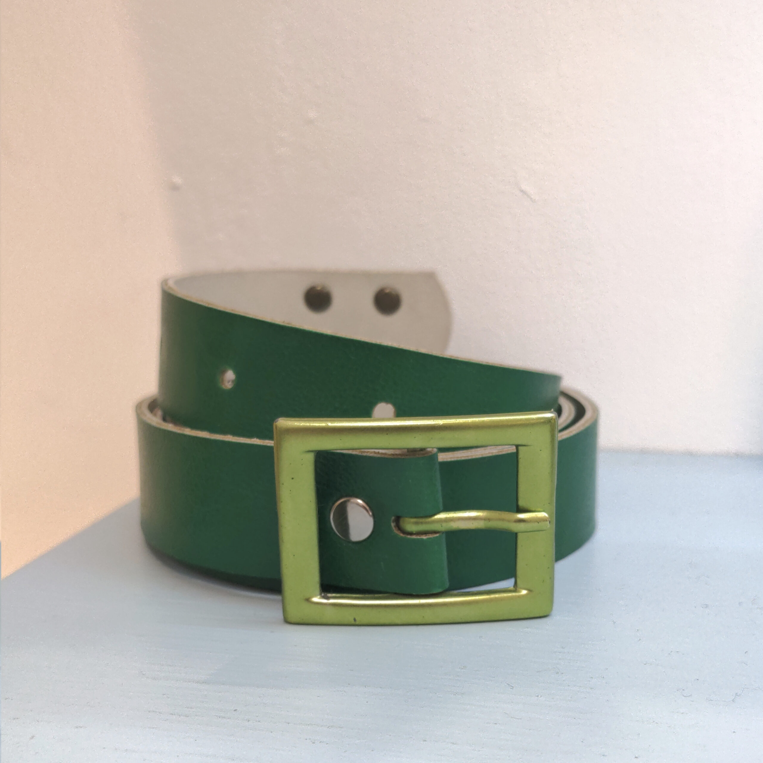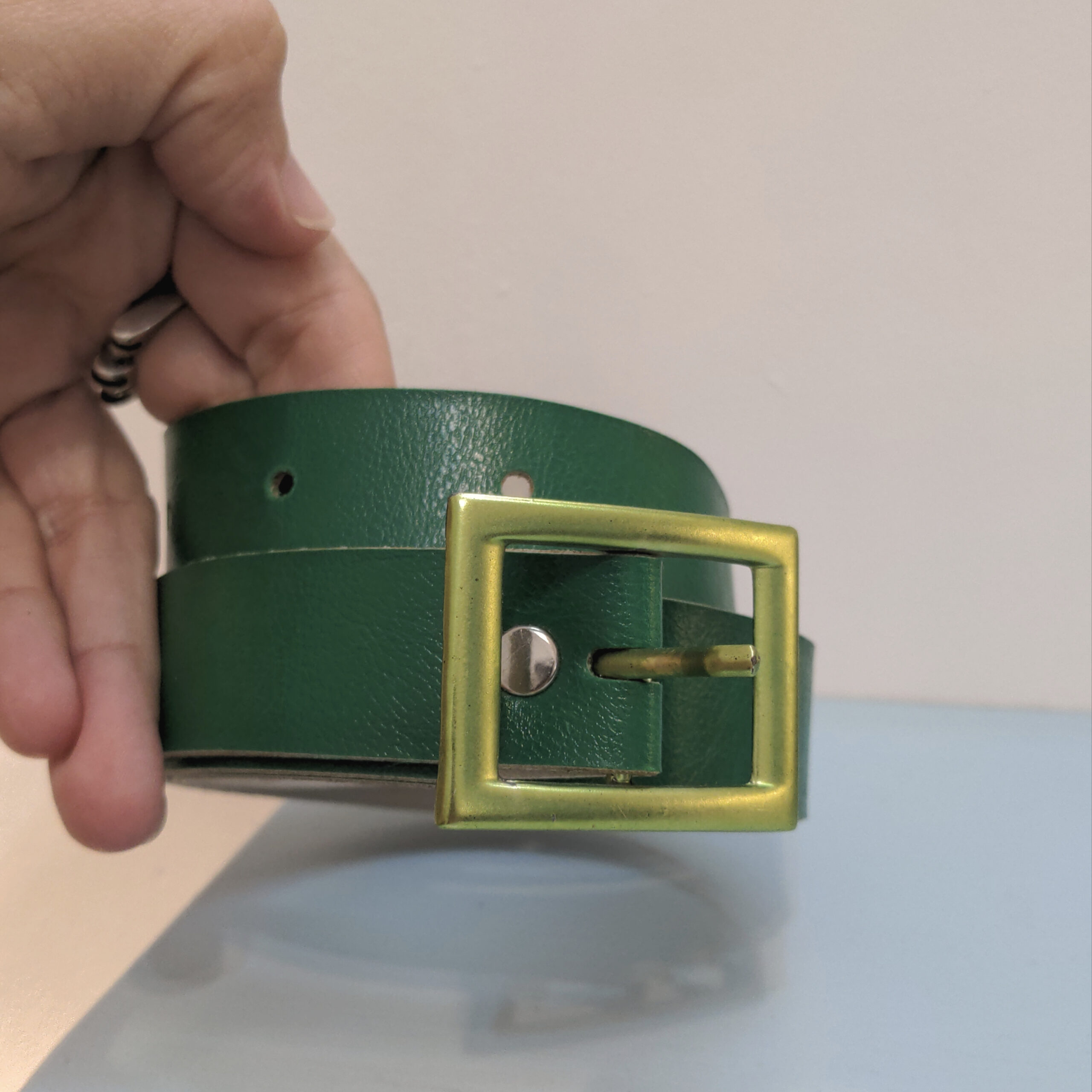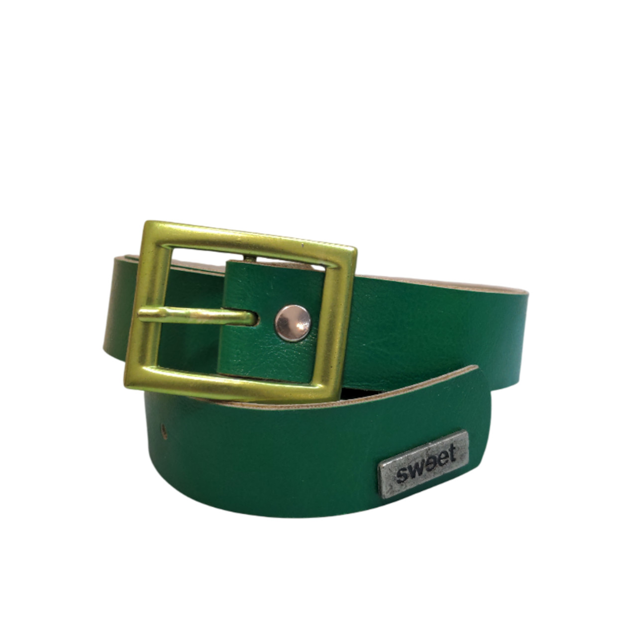 Cinturón sintético color verde con hebilla verde metalizada en color verde. El interior es color claro.