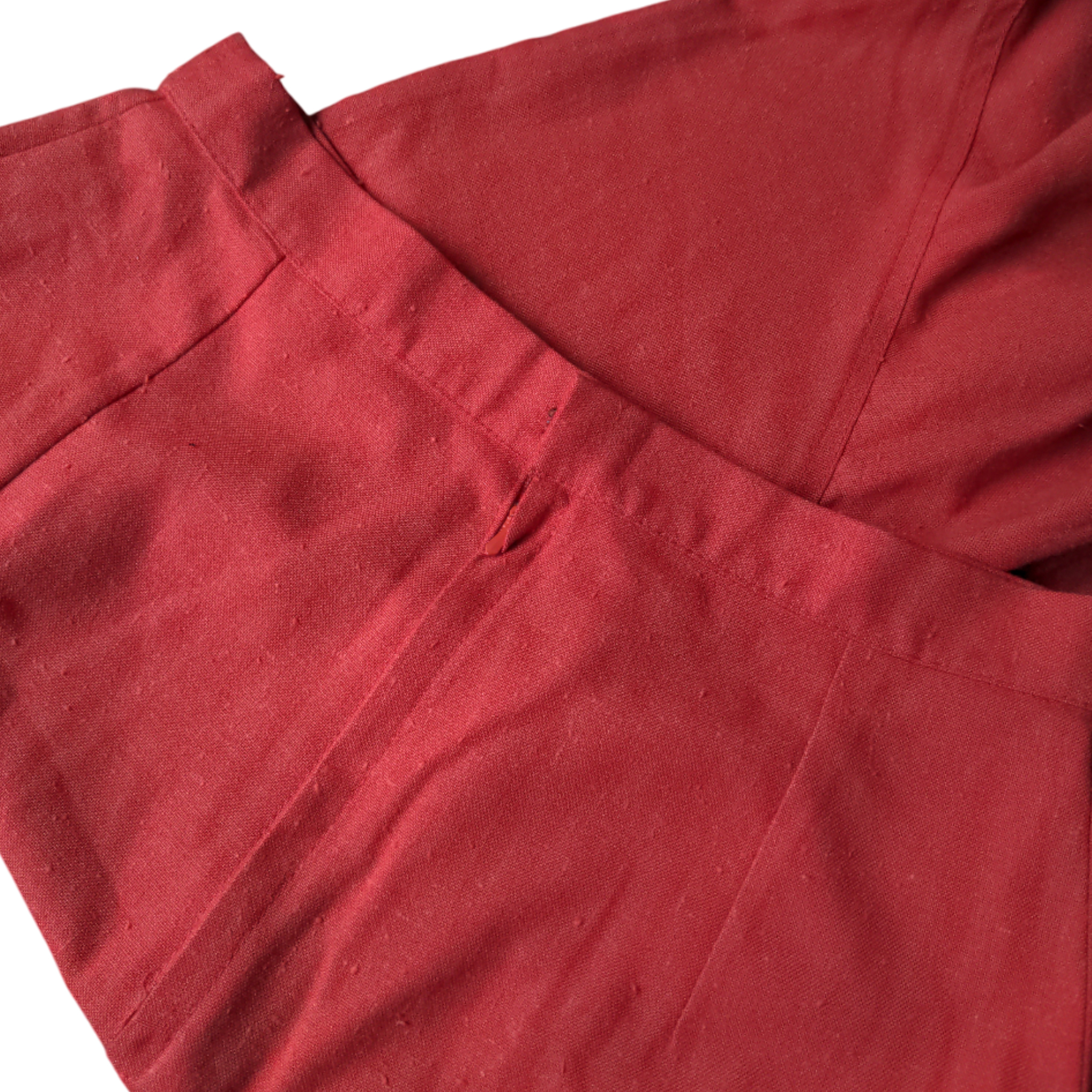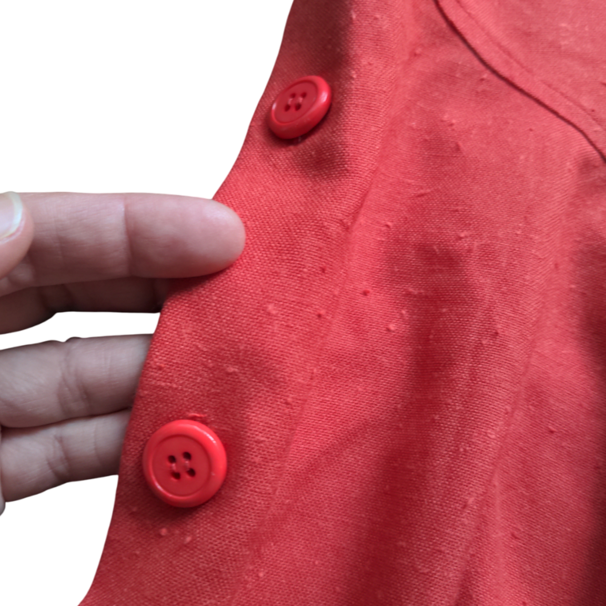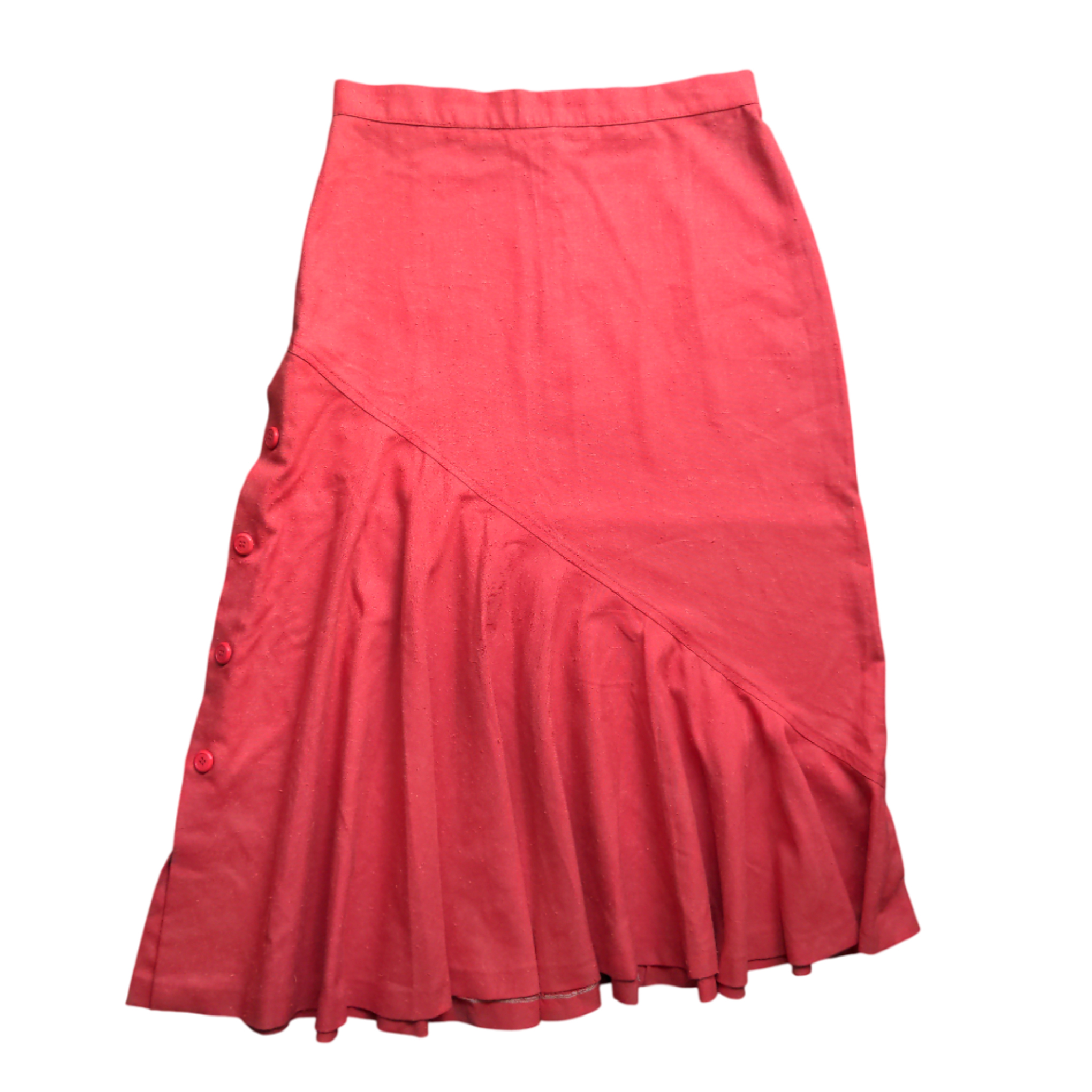 Falda roja con corte irregular desde la cadera al ruedo. Cintura con cierre y ganchito atrás. A partir de la cadera presenta una línea transversal donde la falda toma vuelo y a un costado tiene apertura con botones al tono.