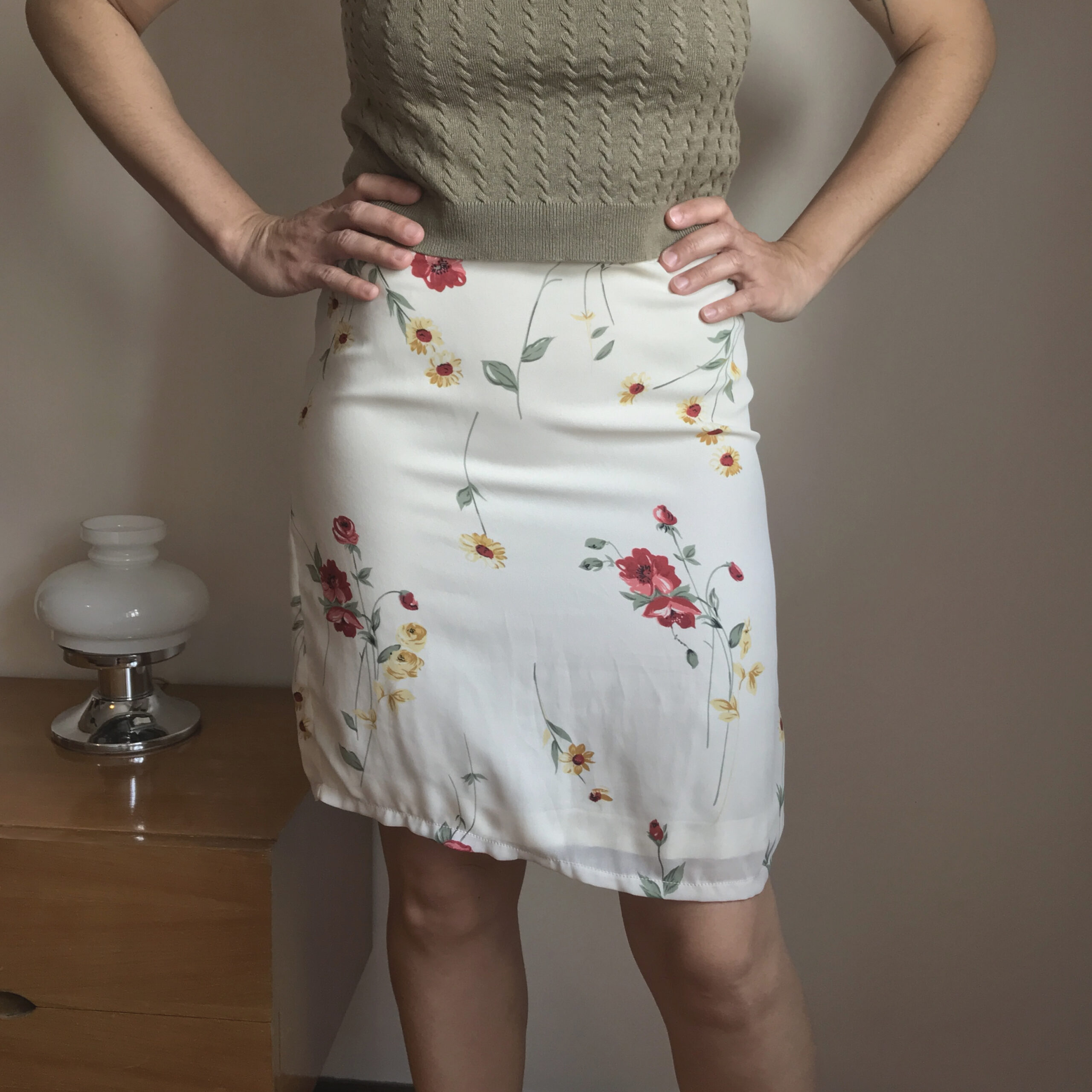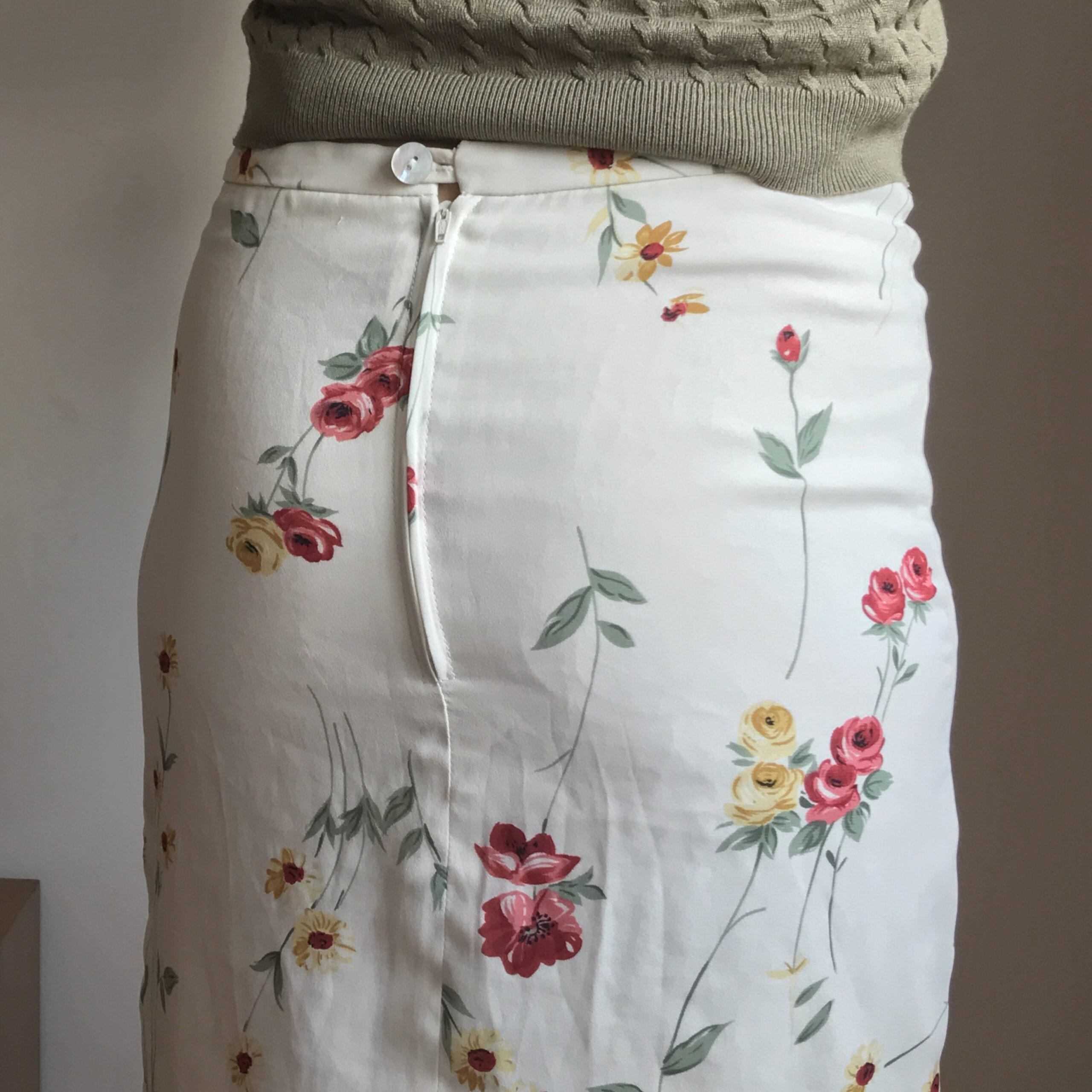 Falda de gasa estampada, color manteca con estampa de flores en tonos bordó y hojas verdes. Interior forrado a tono. Cierra atrás con cierre y botón.