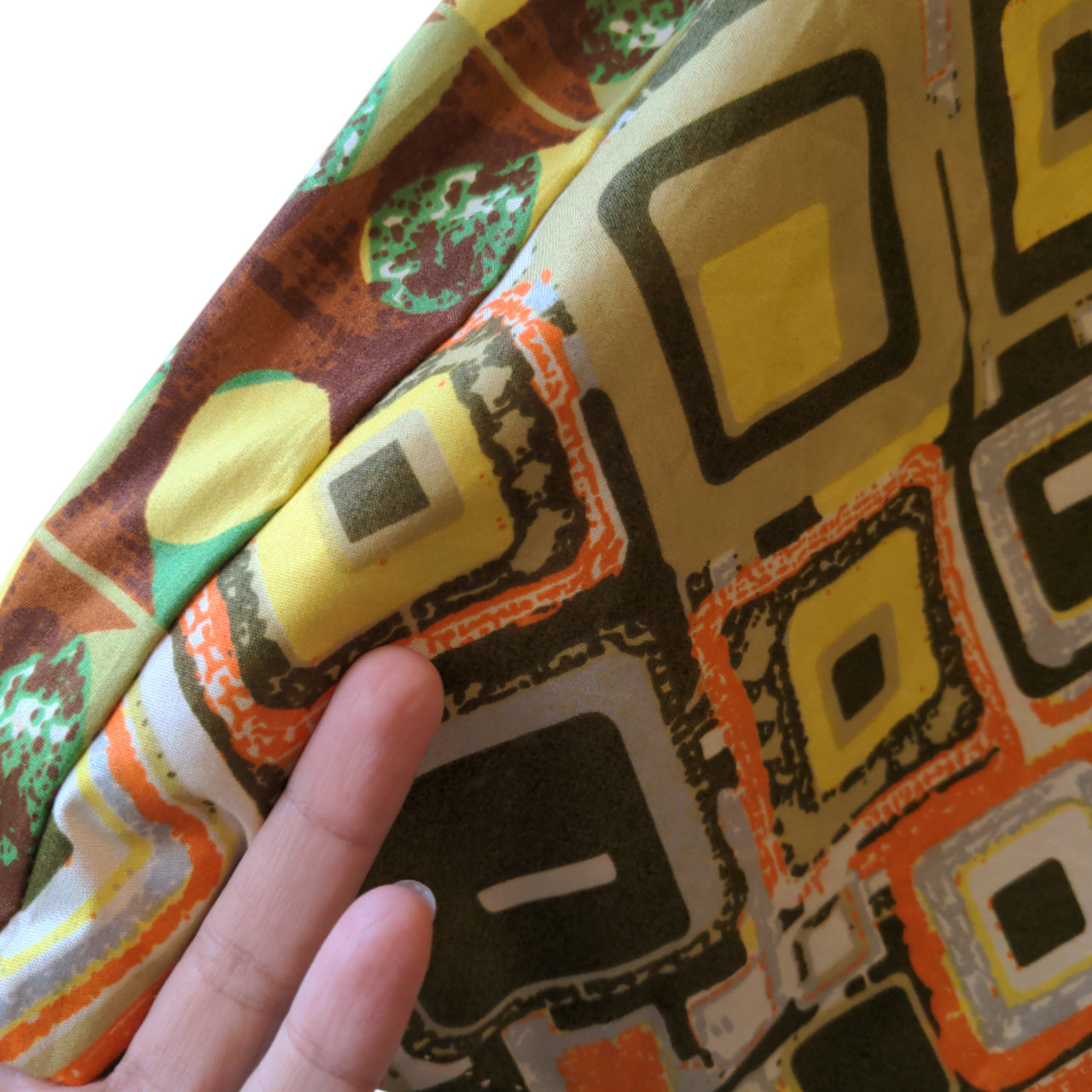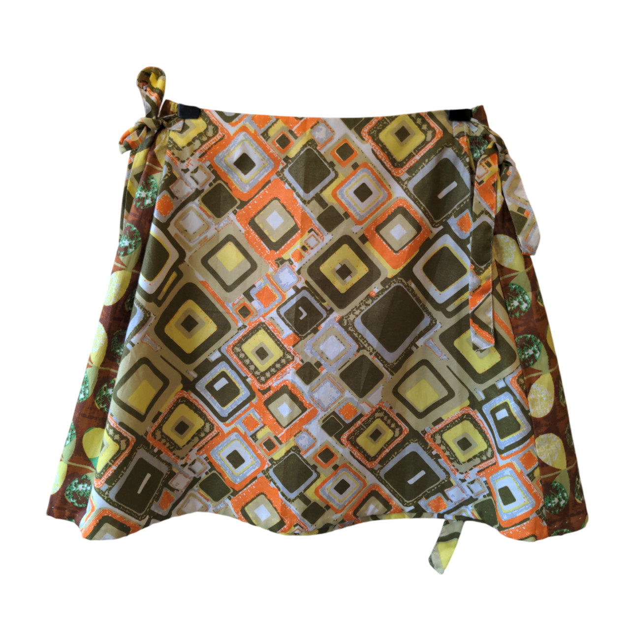 Falda de gabardina fina estampada con rombos en distintos tamaños en colores verdes, naranja, gris y marrón. El corte es trapezoidal y a los costados la cintura tiene elástico, tela pala ampliar el talle y lazos para ajustar, a los costados la tela es distinta en los mismos tonos.