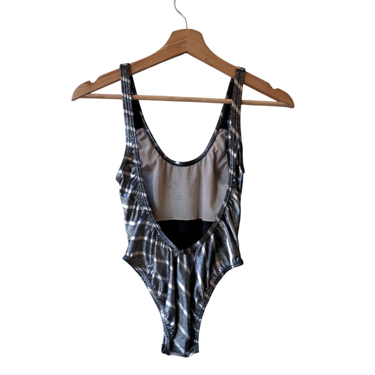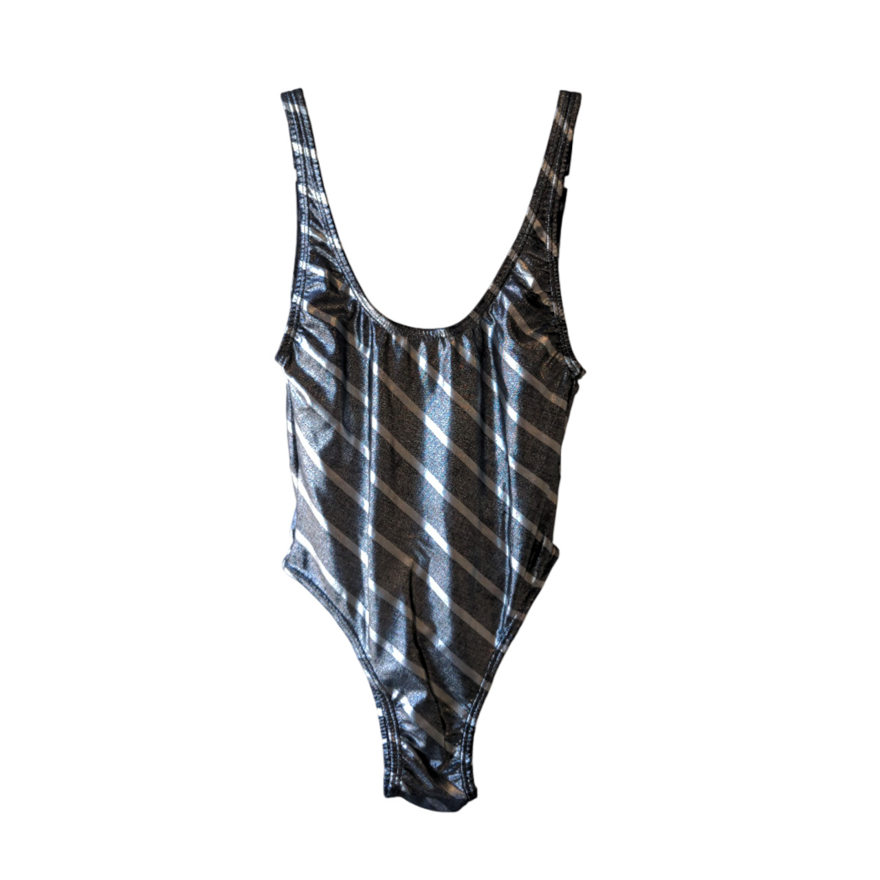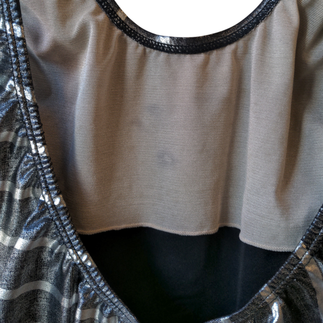Malla plateada, fondo oscuro plateado con líneas plateadas más claras en diagonal. Cuello redondo y espalda con cuello redondo escotado.