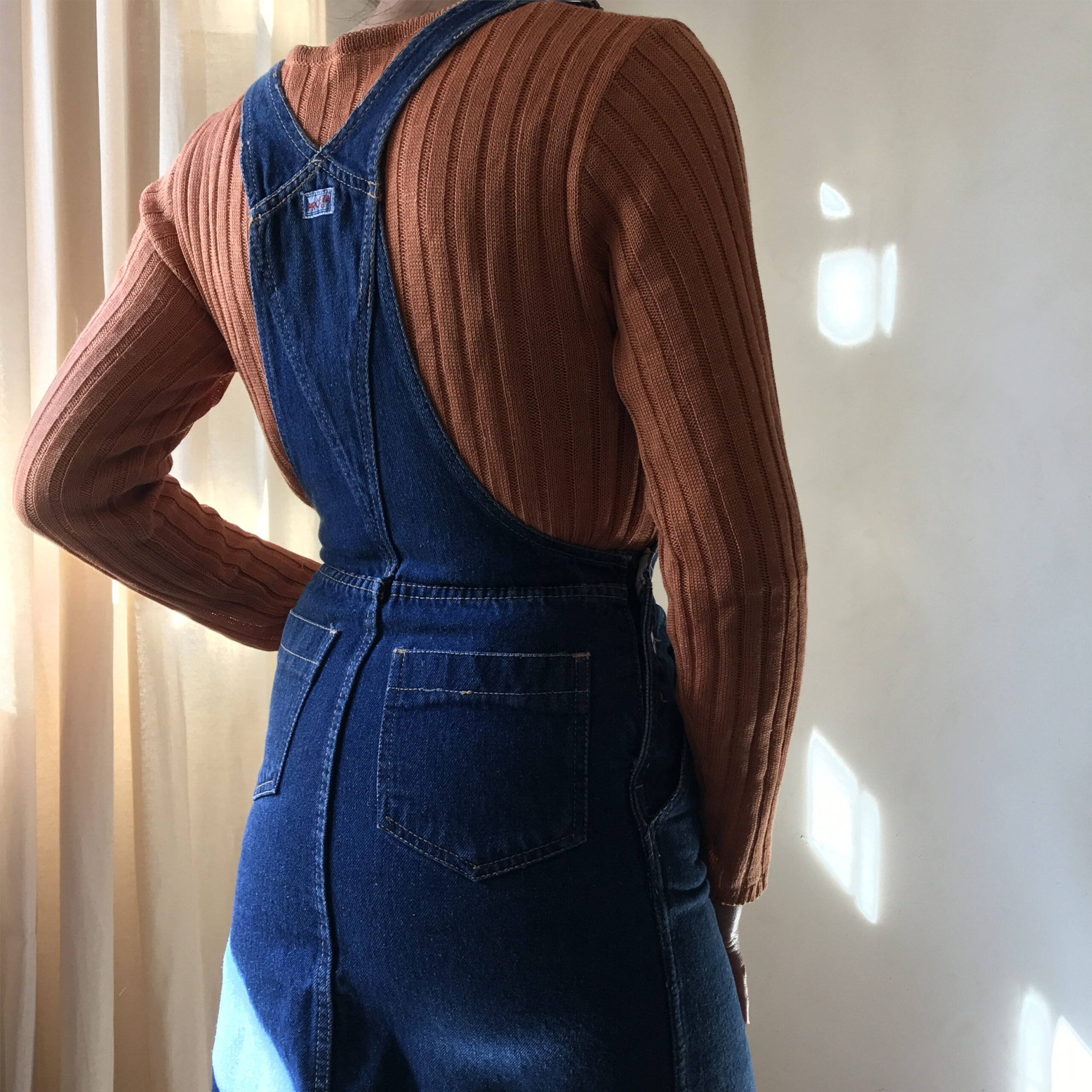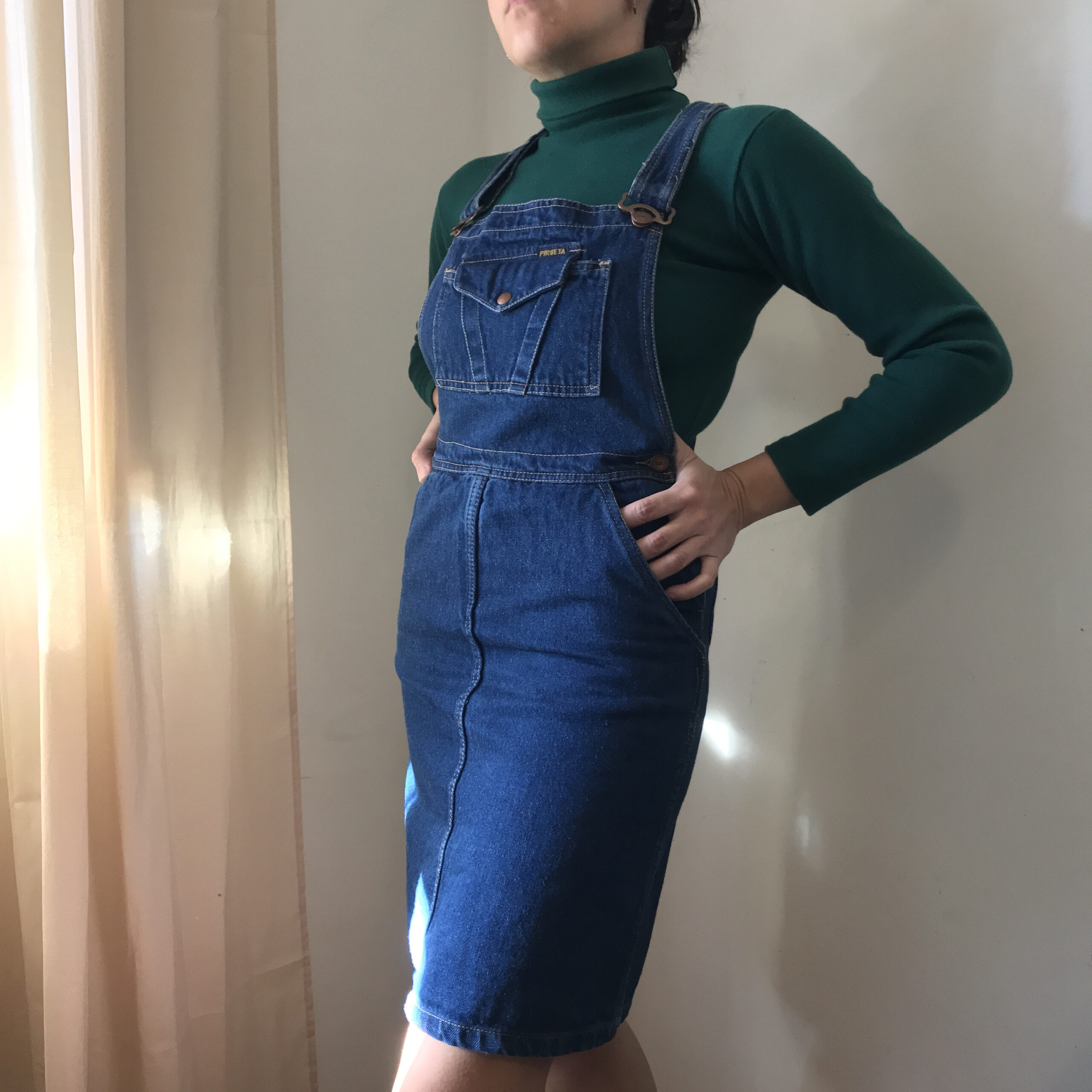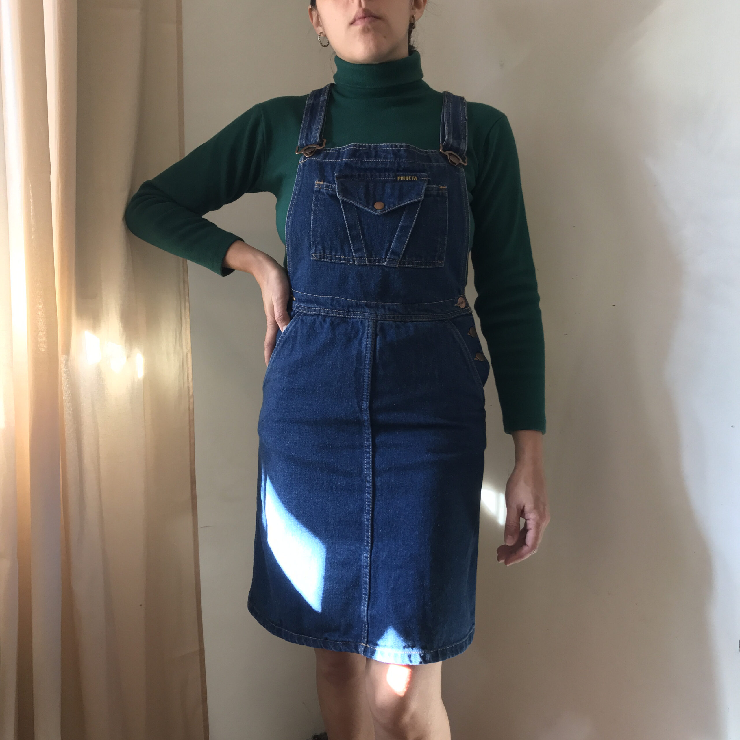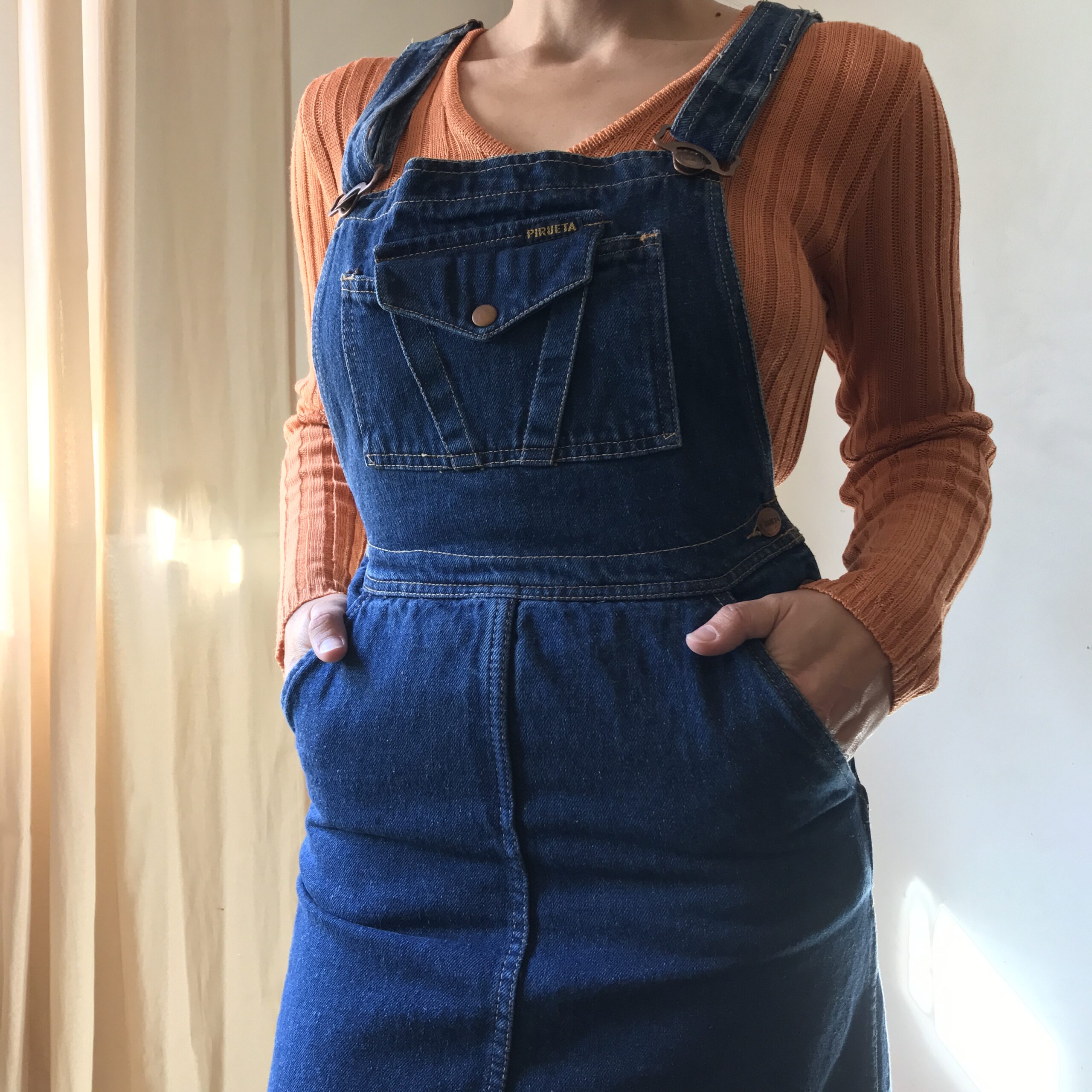 Jumper falda Pirueta de jean azul con costuras marrones, clásico. Bolsillos traseros, delanteros y en pechera. Cierra con botones a los laterales y precilla metalica con boton en pechera.