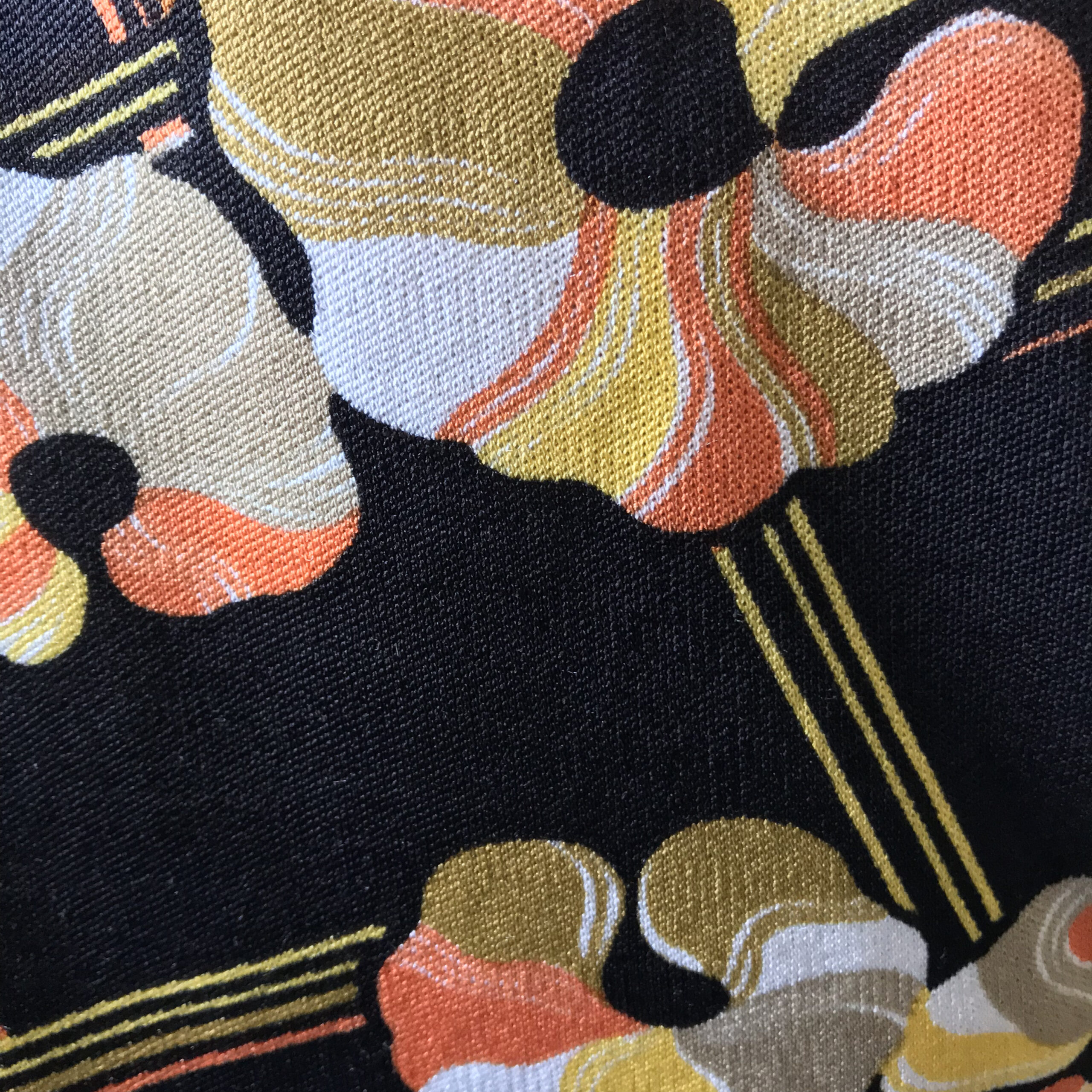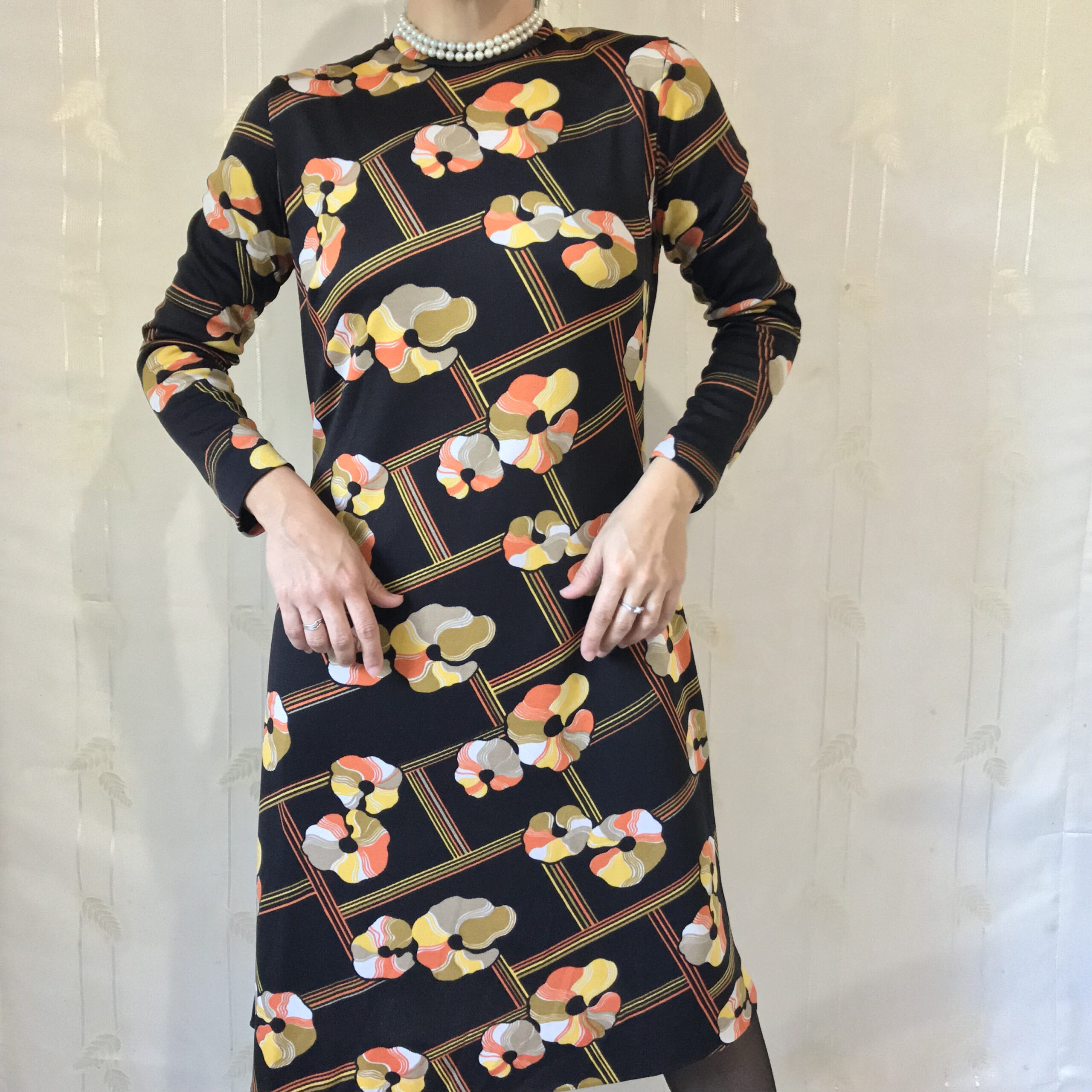 Vestido sintético con estampa geométrica de líneas rectas paralelas y perpendiculares y manchas que simulan flores en tonos blanco, gris, amarillo y naranja. Mangas largas y cuello redondo bastante cerrado y angosto. Cierra en la parte trasera con cierre al tono.