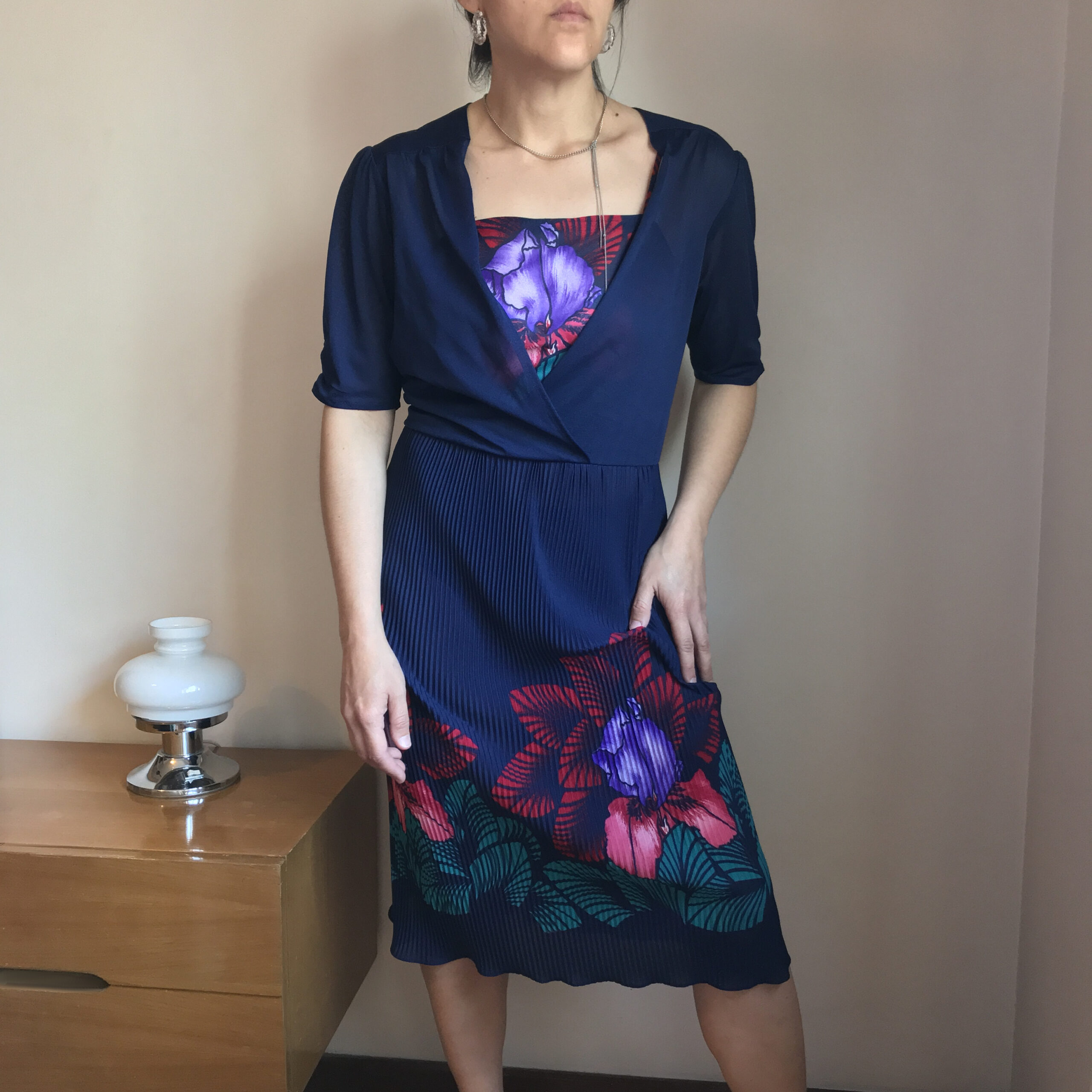 Vestido que simula dos piezas, un vestido sobre una musculosa de tiritas. Manga corta, escote V cruzado. Color azul con falda plisada estampada con flores.