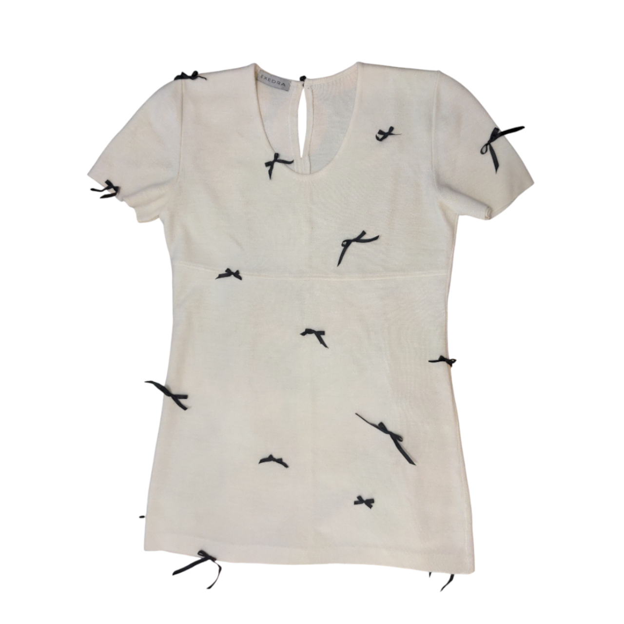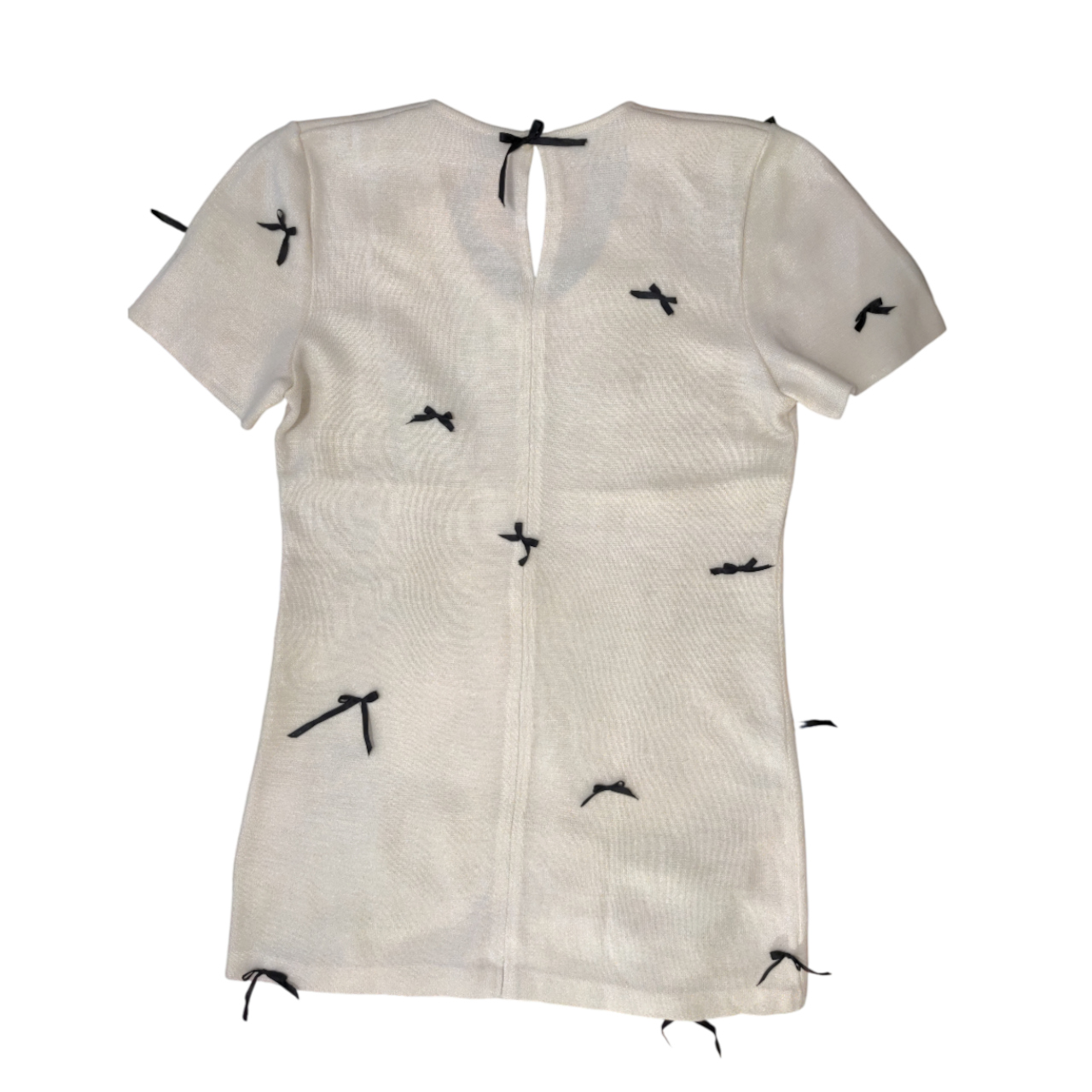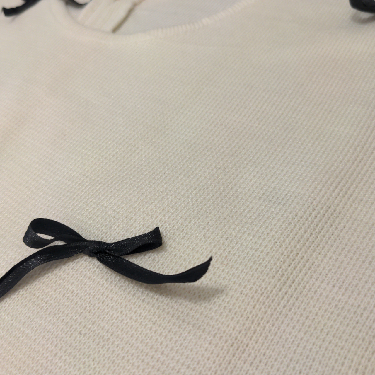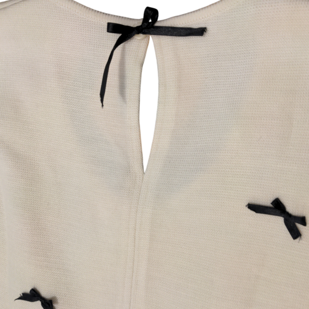 Vestido tejido color manteca. Sintético, no pica, la tela tiene cuerpo. Cuello redondo, manga corta, el diseño tiene un corte en el bajo busto. Atrás en el cuello tiene diseño de gota y cierra con botoncito. Tiene aplicados moñitos de cinta bebé negra por todo el vestido sin seguir un patrón.