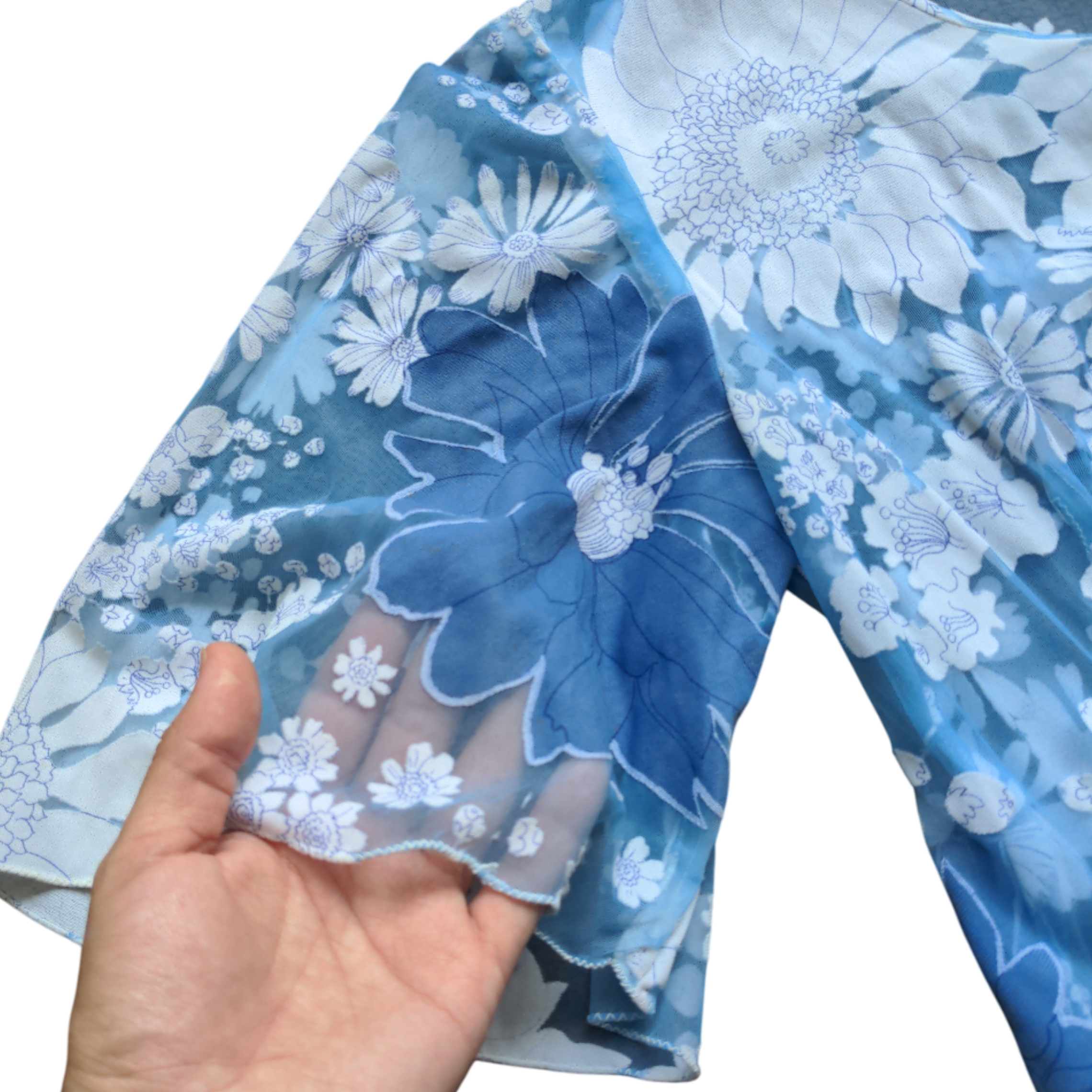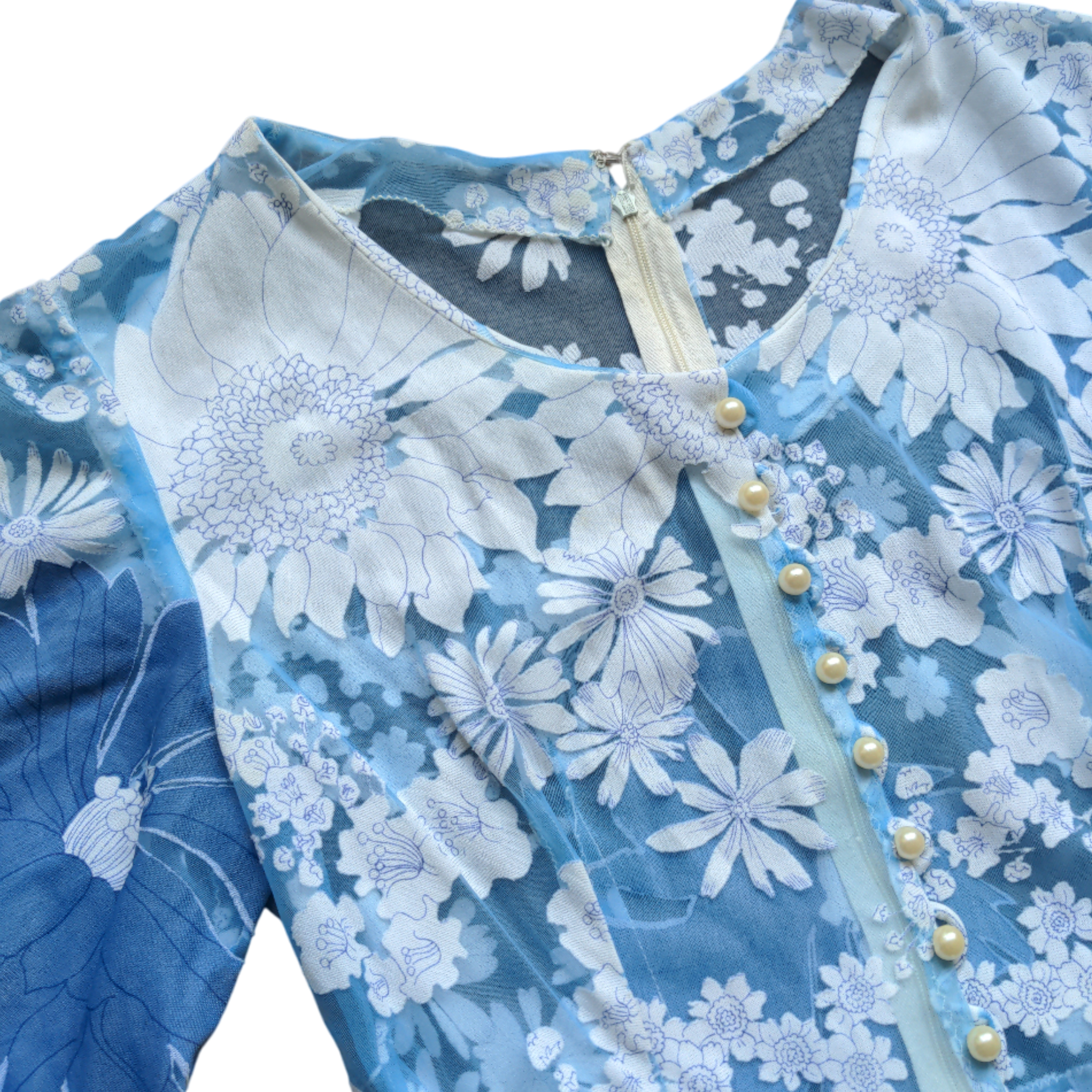 Vestido traslucido con trama como estampa de flores, base de color celeste y flores blancas. Cuello redondo con falso abotonado de perlas al frente, mangas acampanadas, corte en cintura. Cierra atrás con cierre y brochecito.