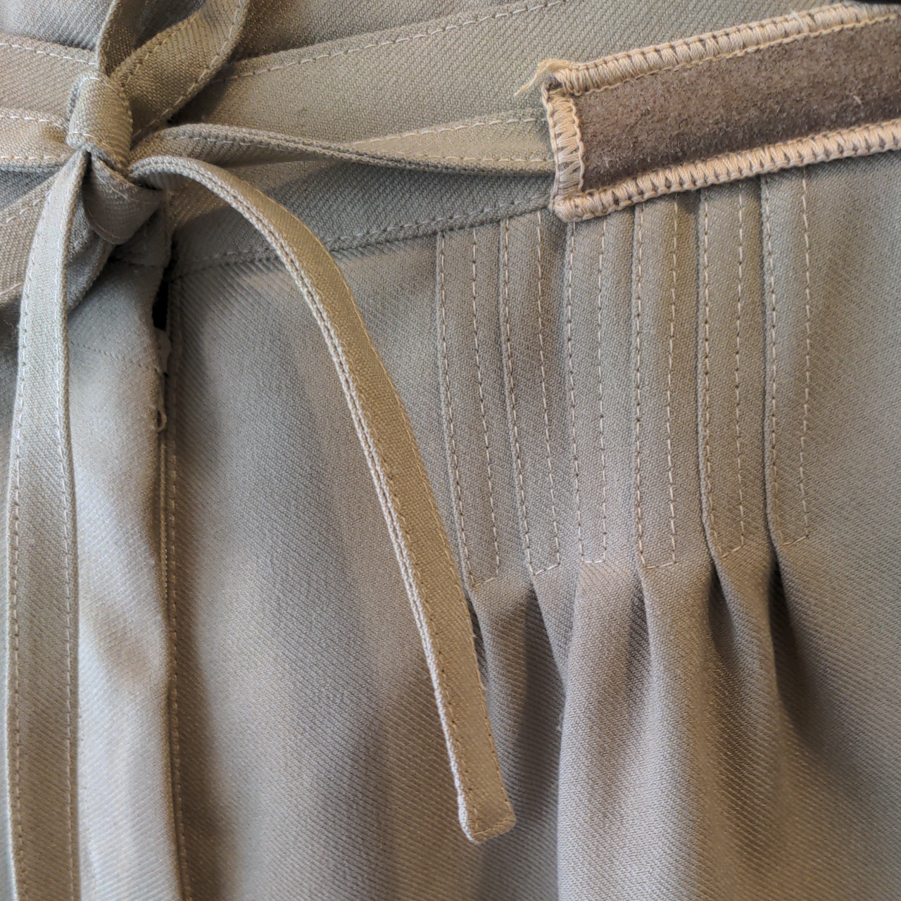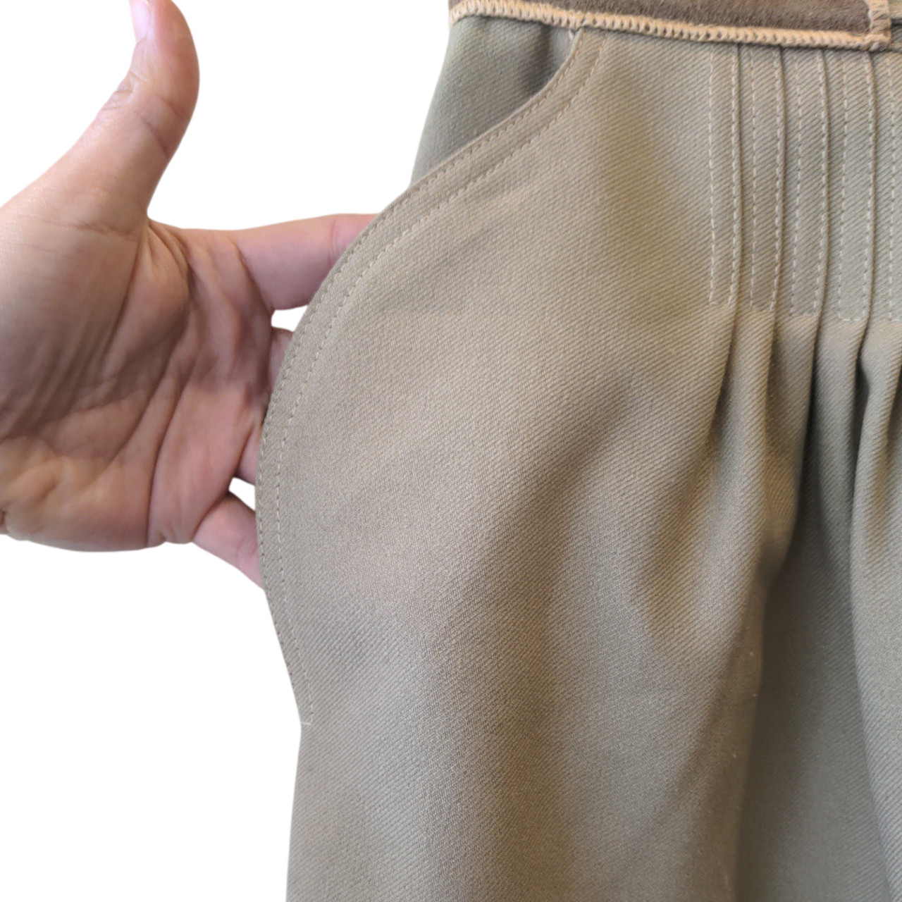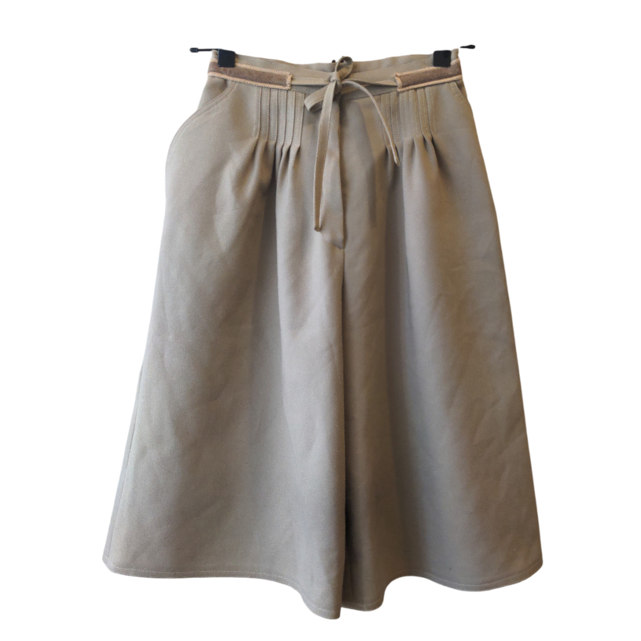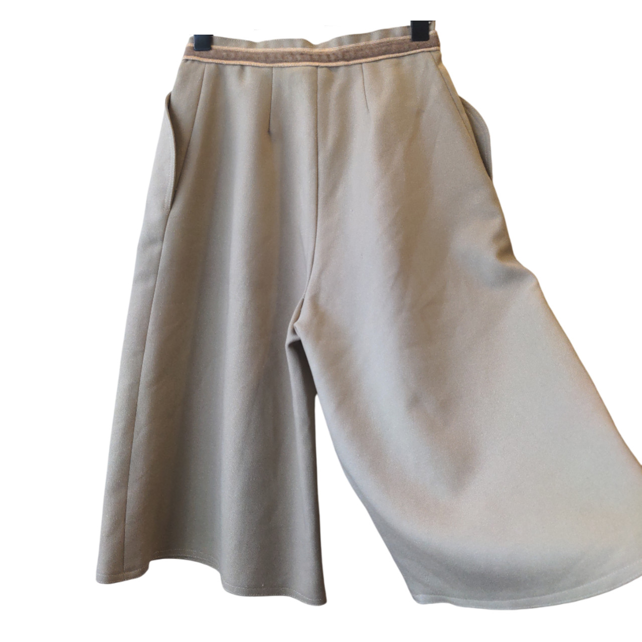 Bermuda corte tipo falda color arena. Cintura con detalle de vivo en gamuza al tono y lazo para atar. Tiene bolsillos con un corte de onda. Al frente tiene varias pincitas que le da vuelo.