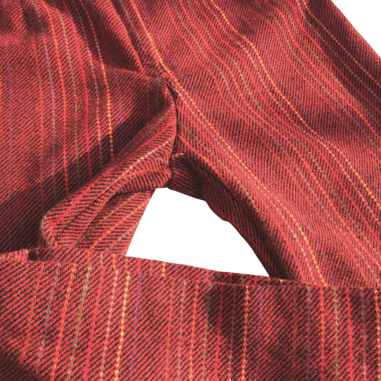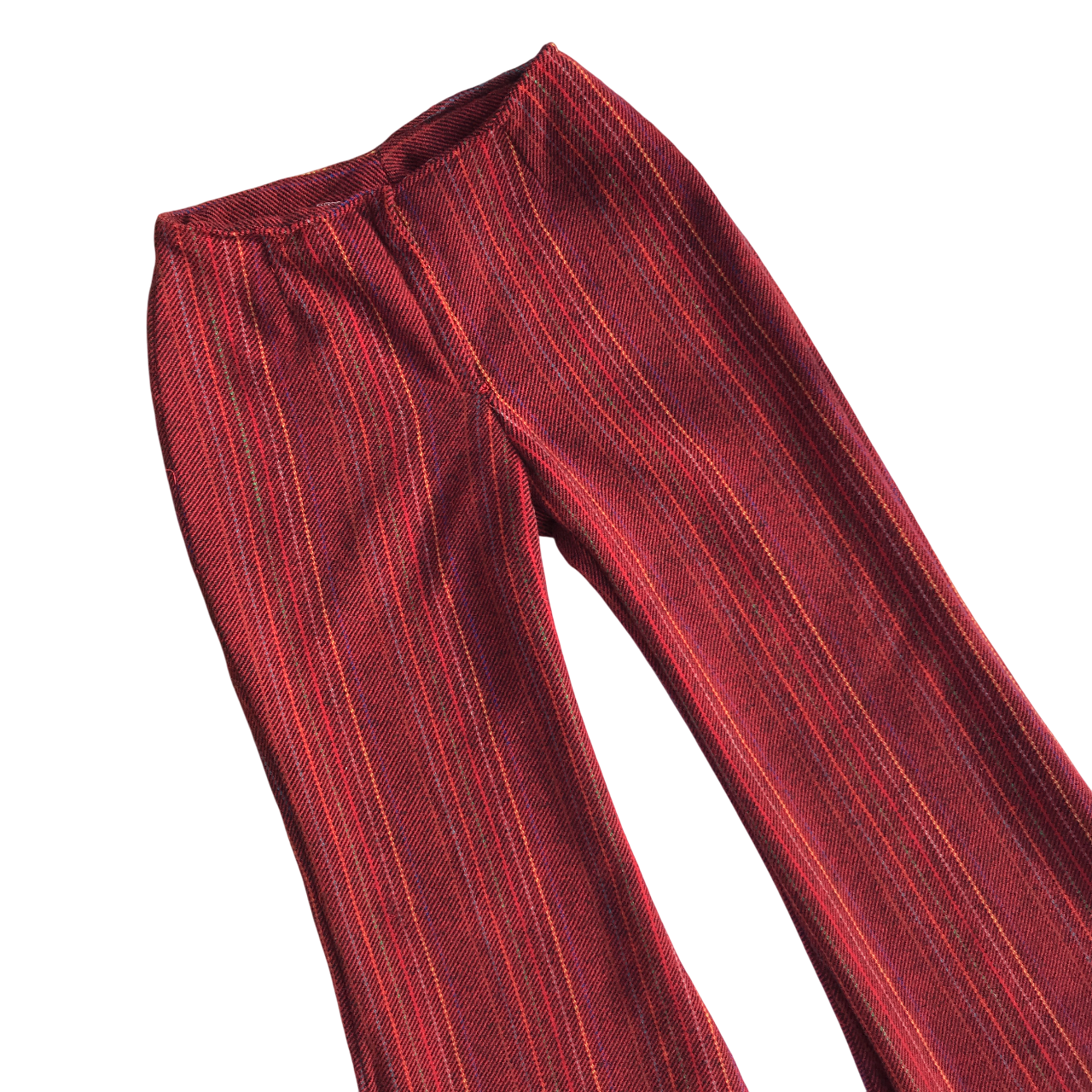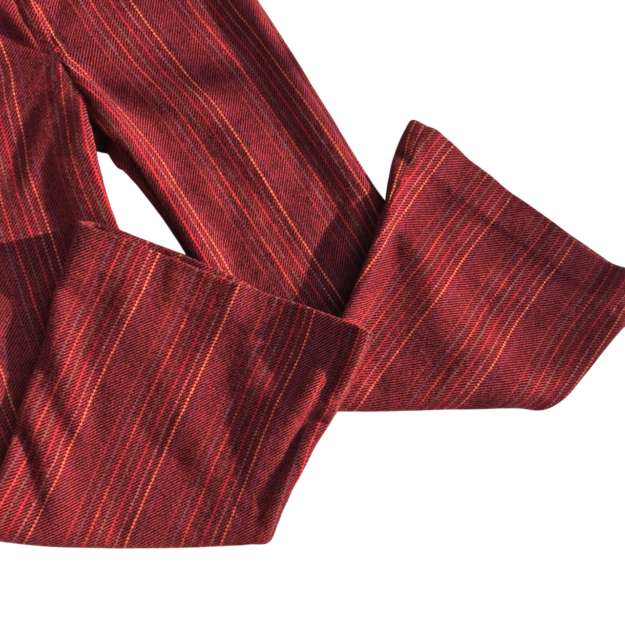 Pantalón oxford de lana rojo con líneas verticales. Sin cintura, cierra al frente con cierre y ganchito.