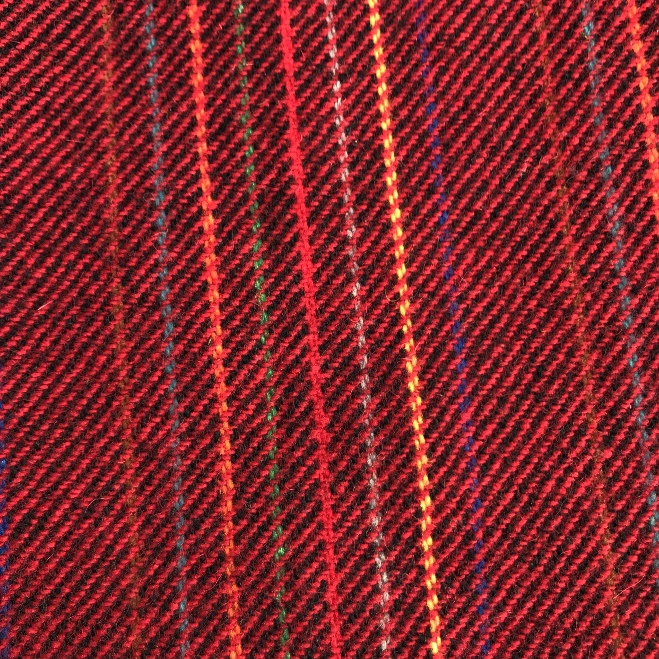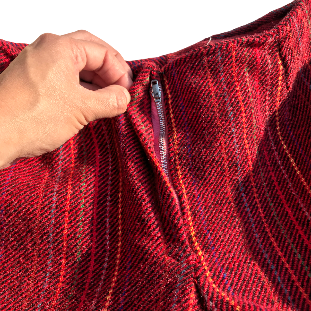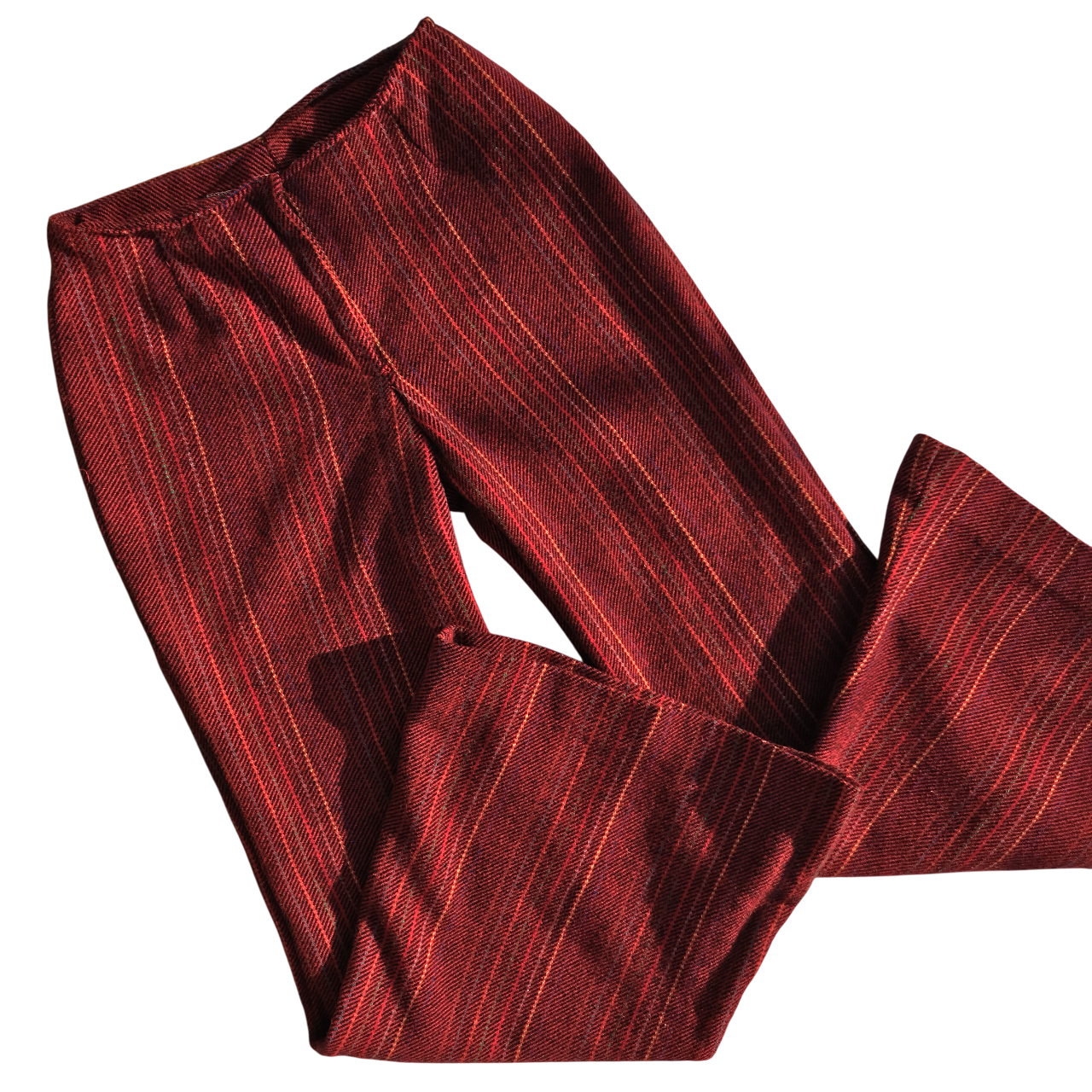 Pantalón oxford de lana rojo con líneas verticales. Sin cintura, cierra al frente con cierre y ganchito.
