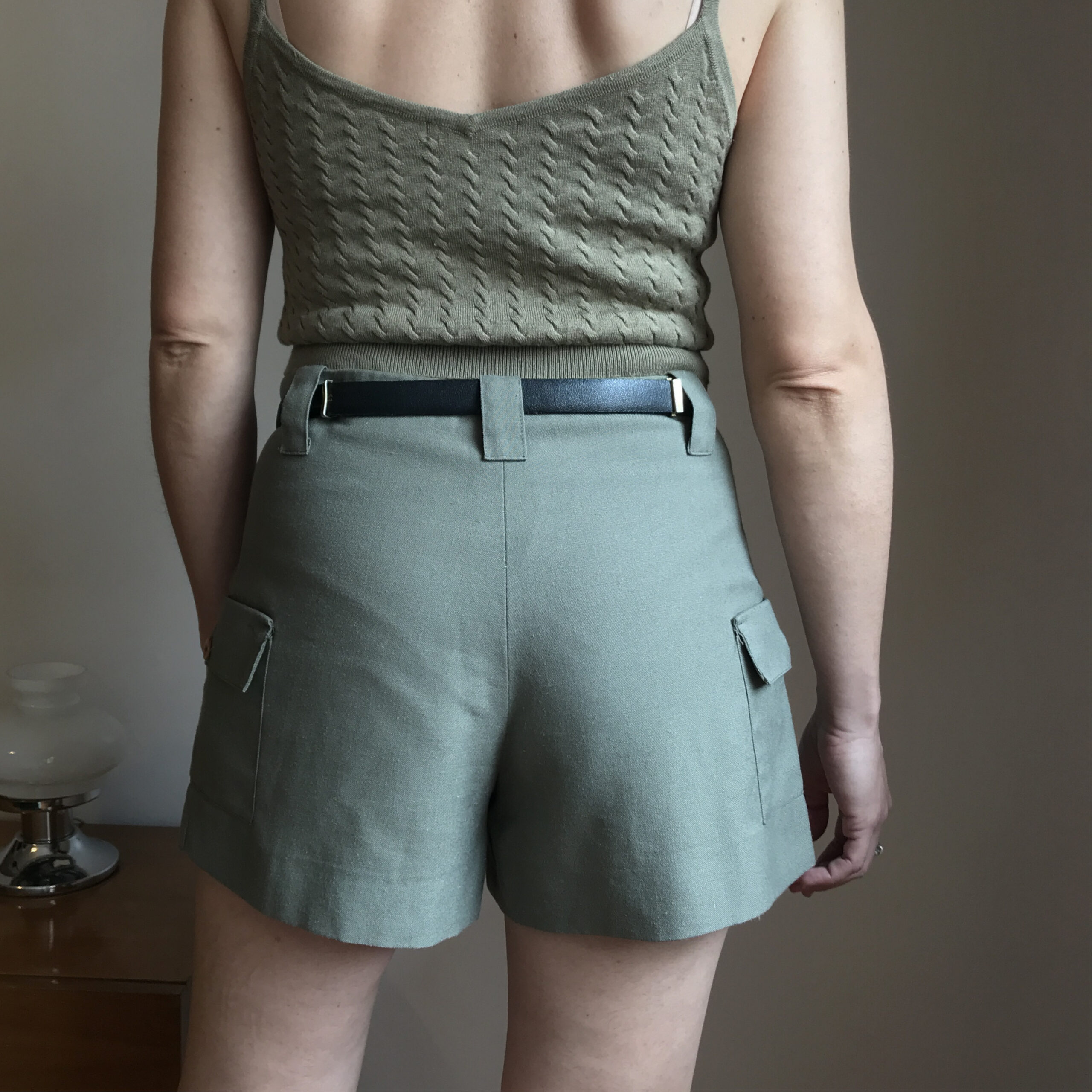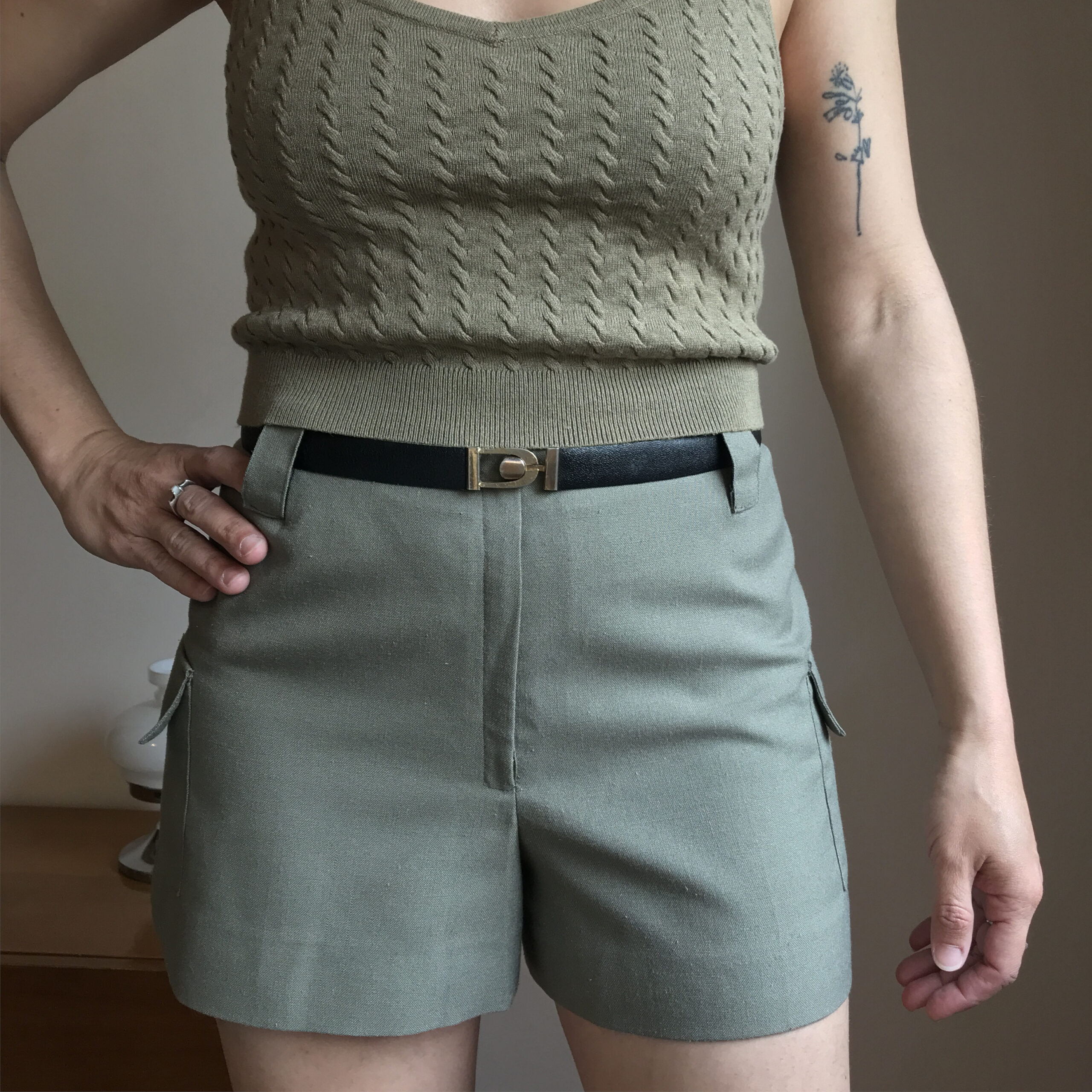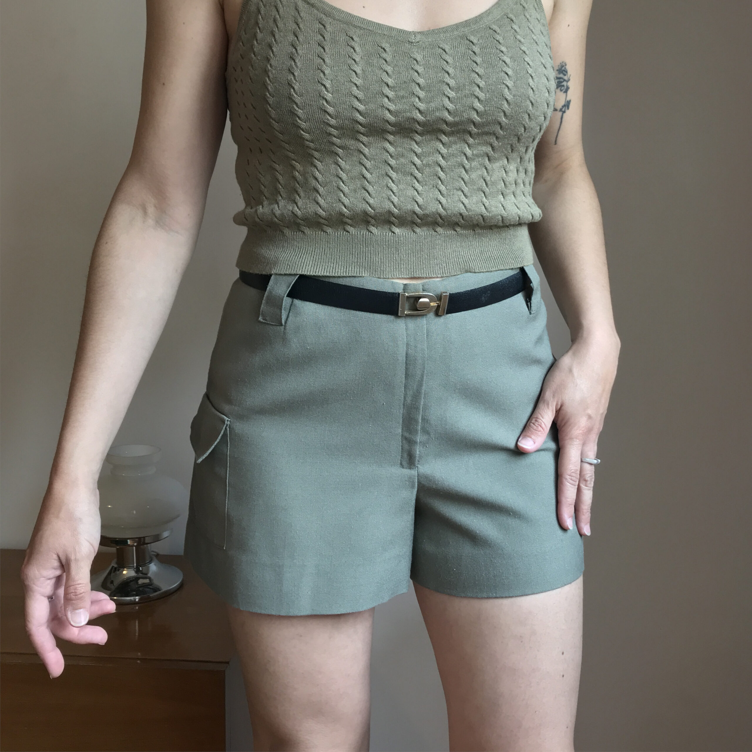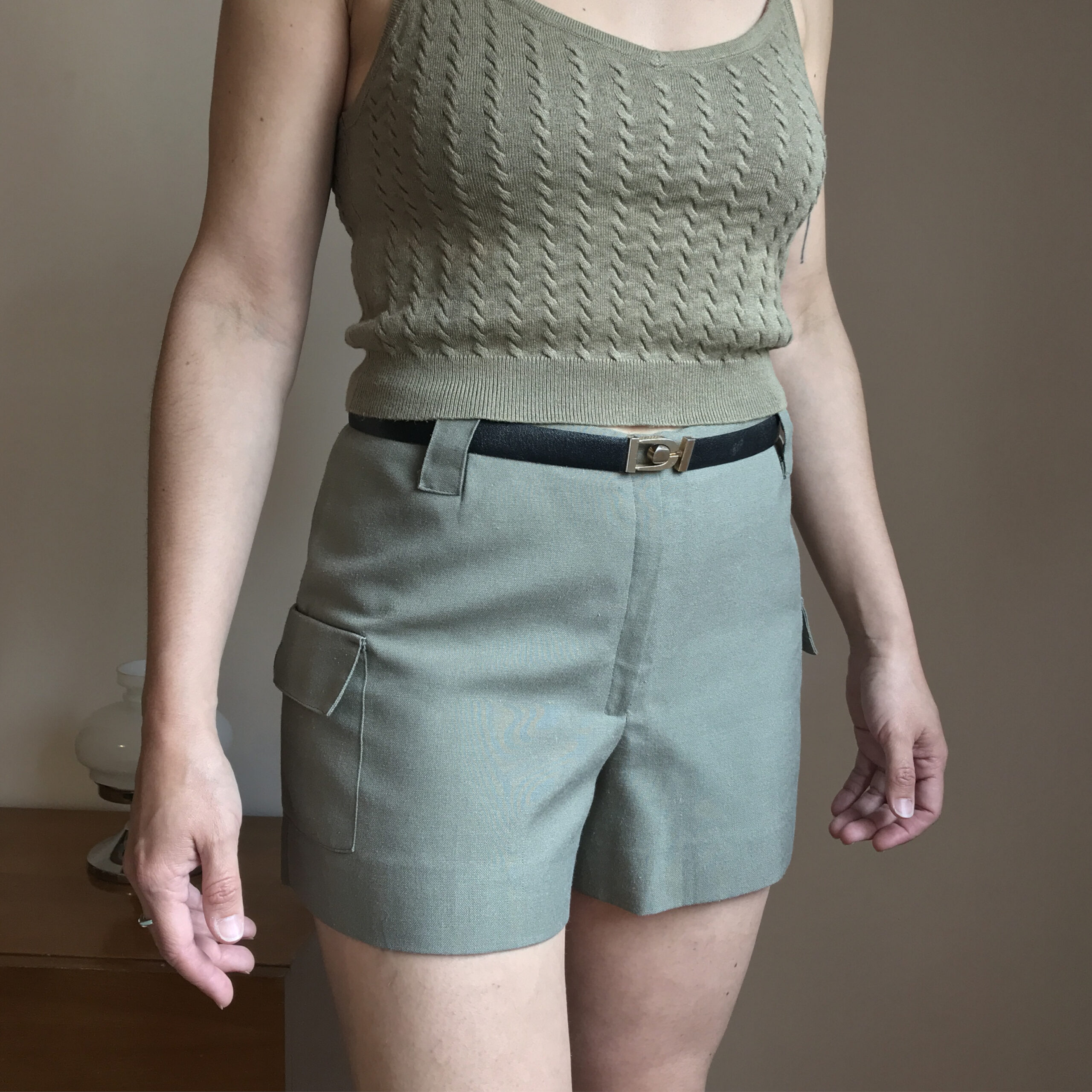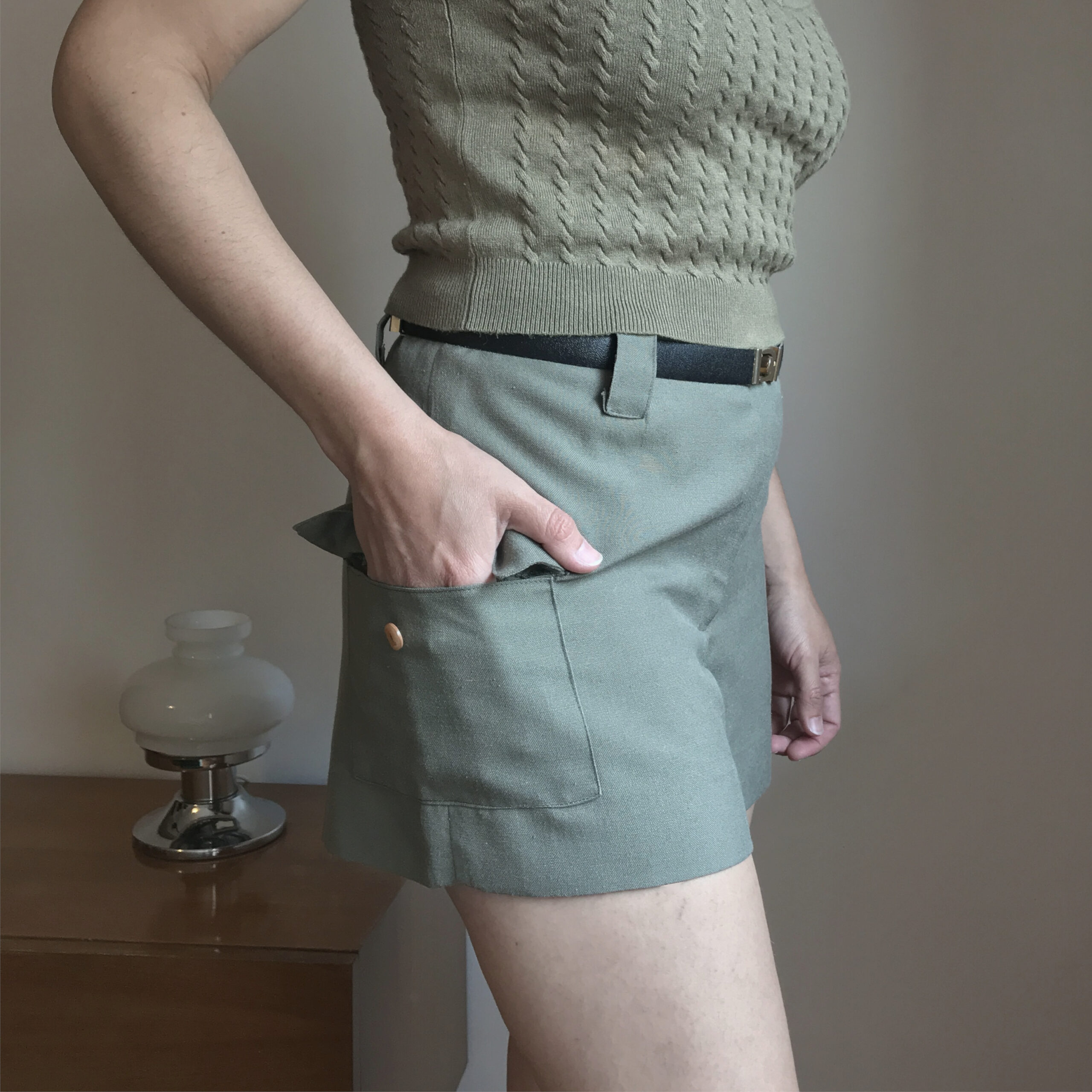 Short liviano de tela tipo lino, color verde musgo, cierra al frente con cierre y ganchito, tiene cintura con pasa cinto y bolsillos a los costados con tapita y botón.